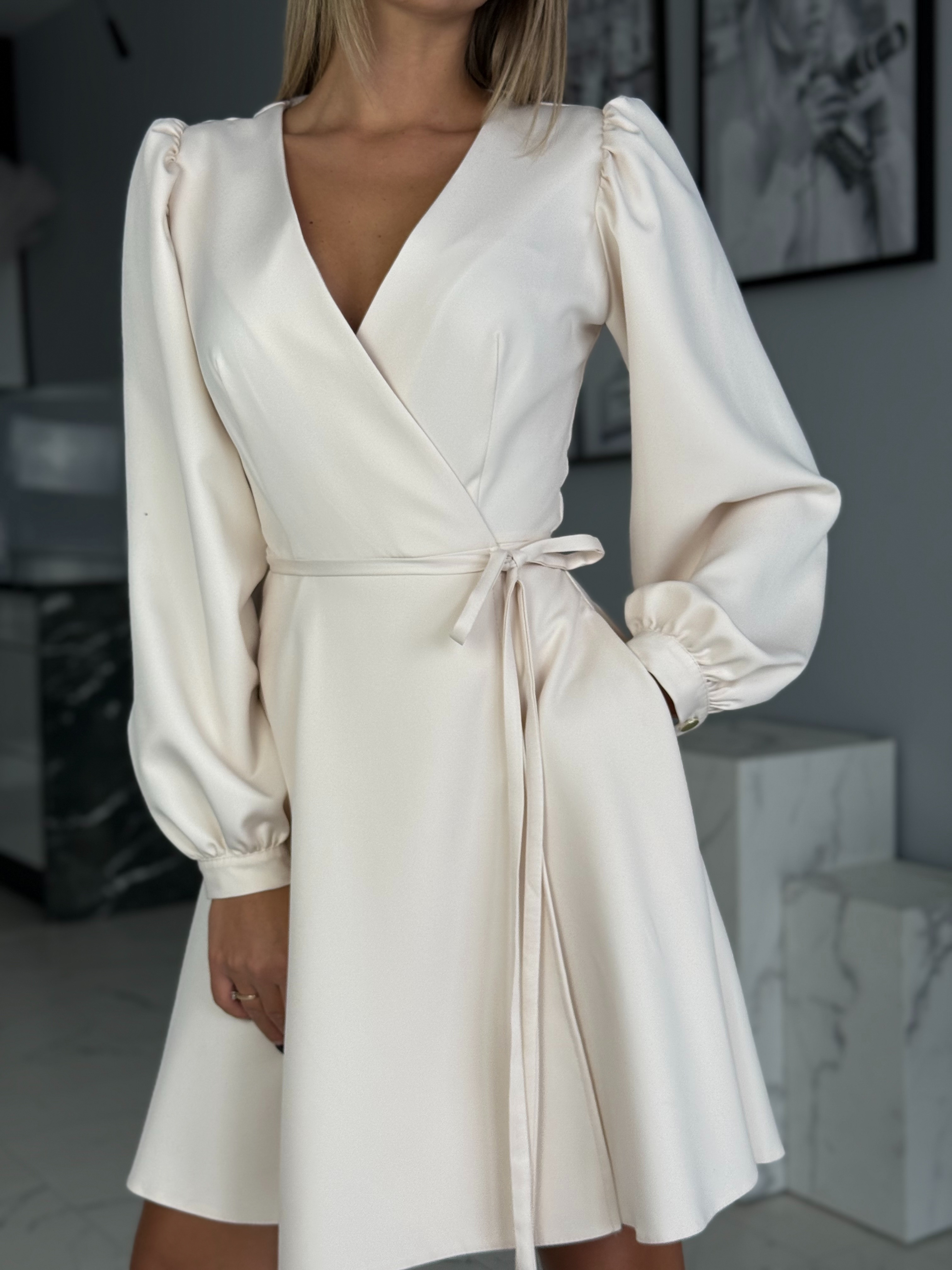 Kleidil on pikad varrukad dekoratiivsete mansettidega, mida kaunistab elegantne kuldne nööp – detail, mis lisab tervikule luksuslikku aktsenti. Vöökohal olev seotav pael võimaldab kleiti vastavalt soovile reguleerida, tuues esile talje ja luues kauni, naiseliku silueti.