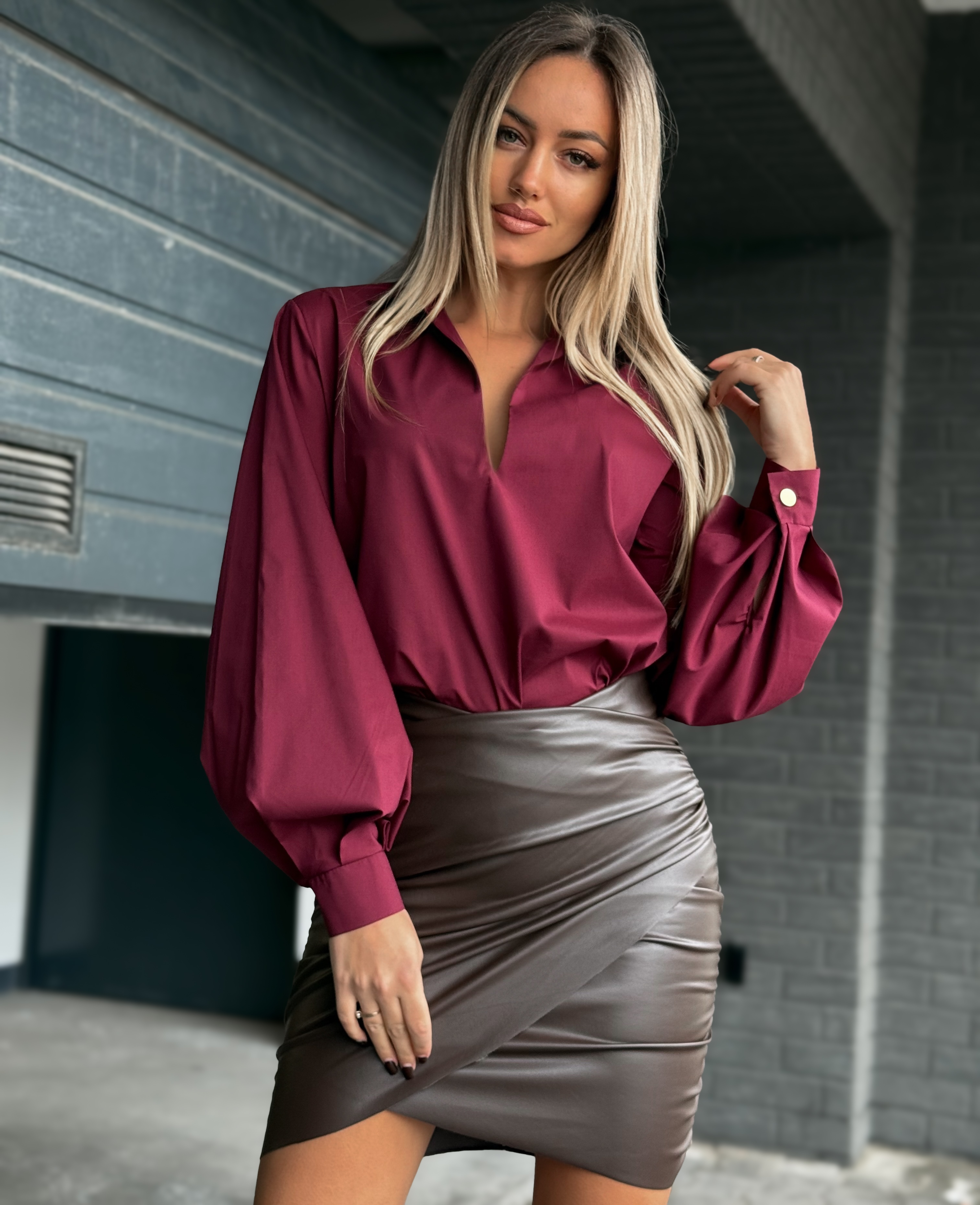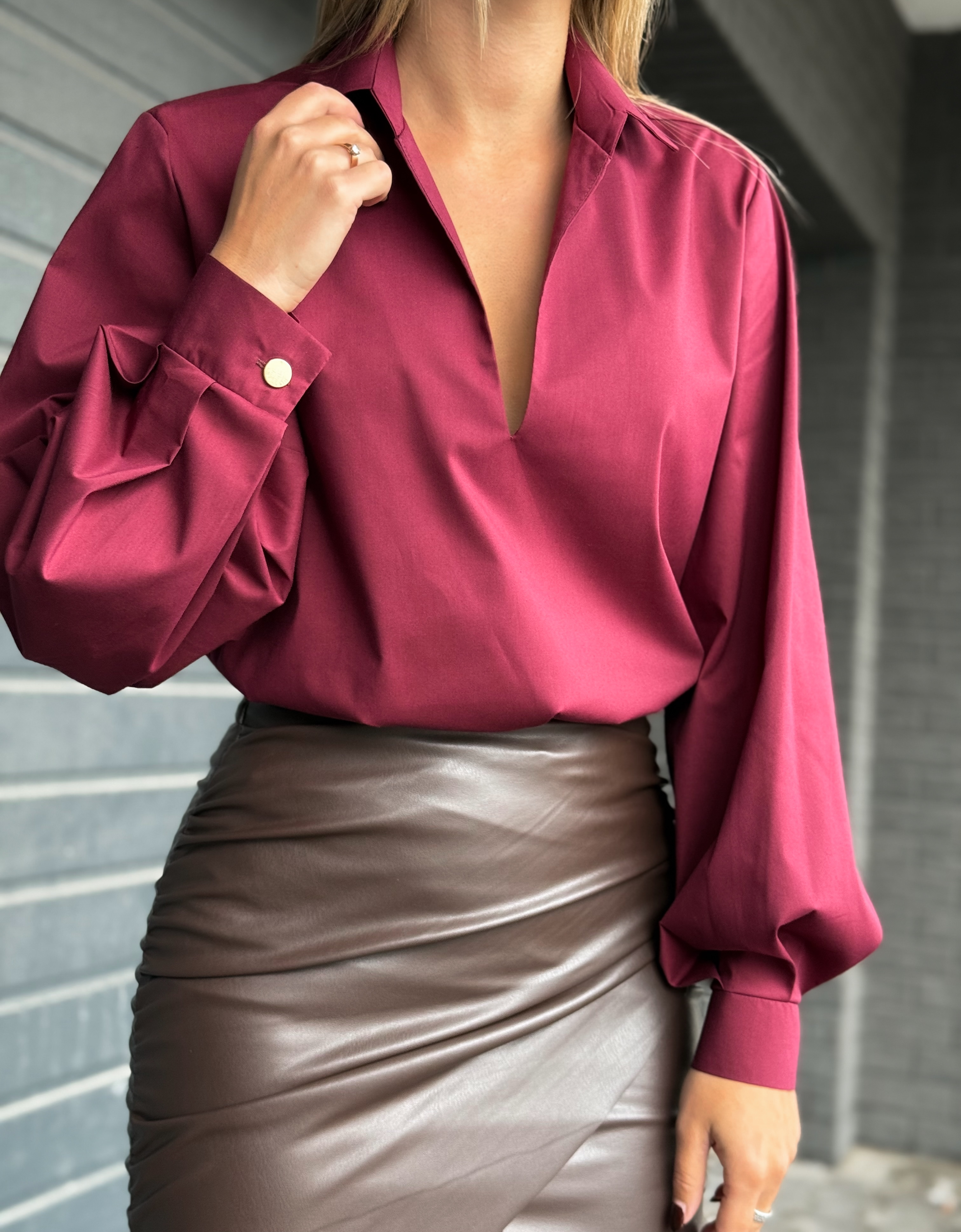 Burgudia puhvis varrukatega pluus on 100% puuvillast ning igati elegantne! Sobib kombineerimiseks erinevate riietega. Pluusil on klassikaline lõige, V-kaelus, krae ja nööpidega käis.