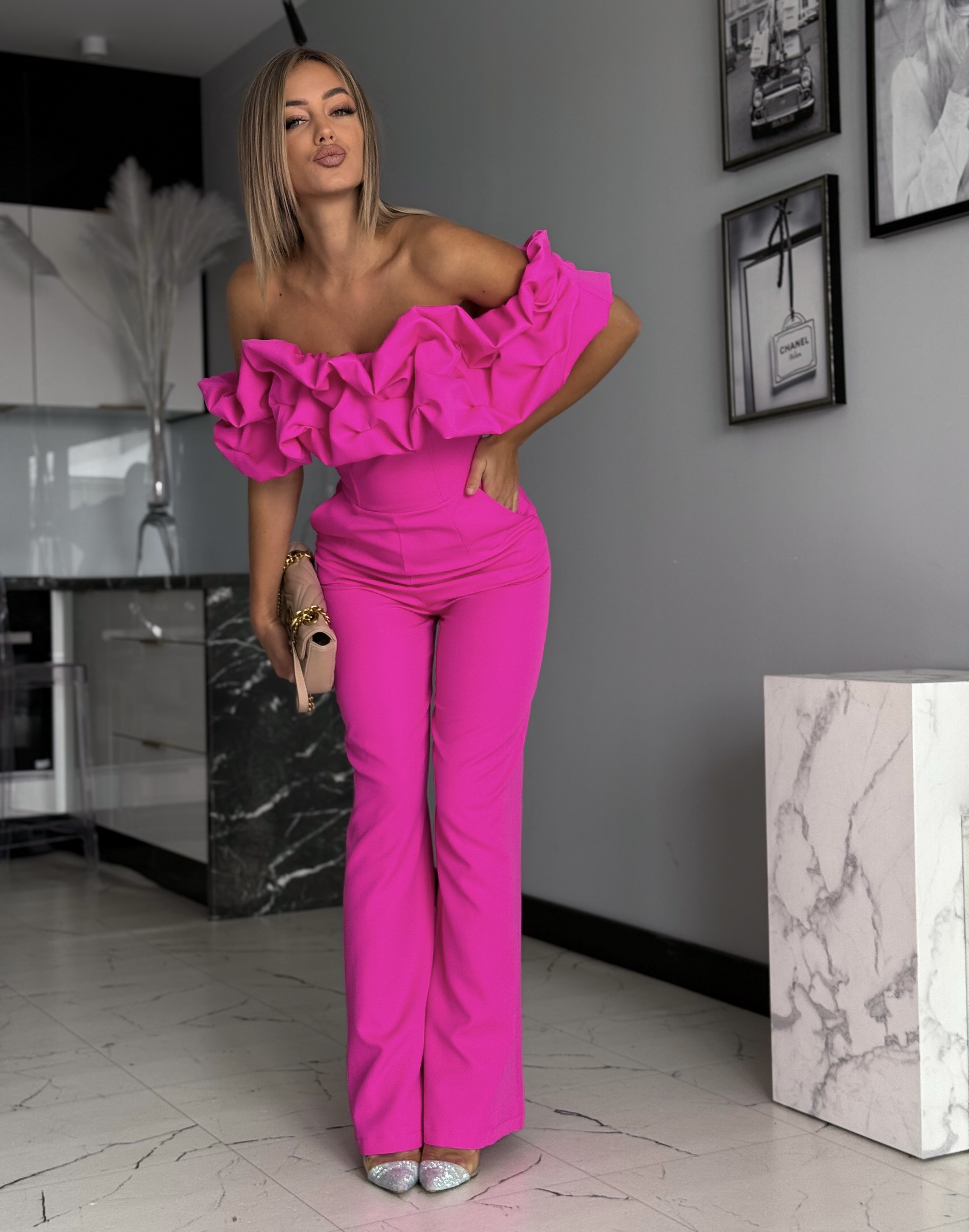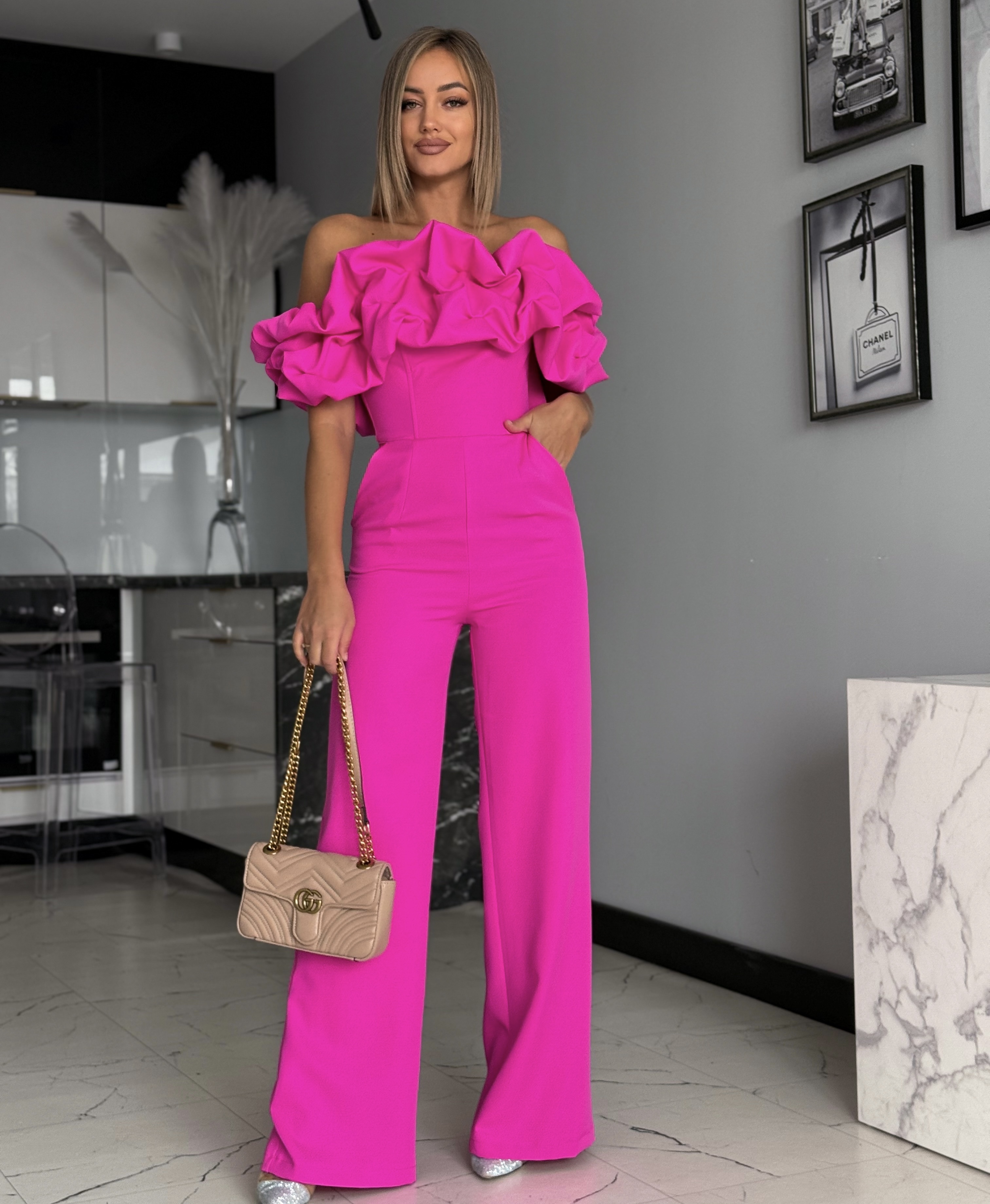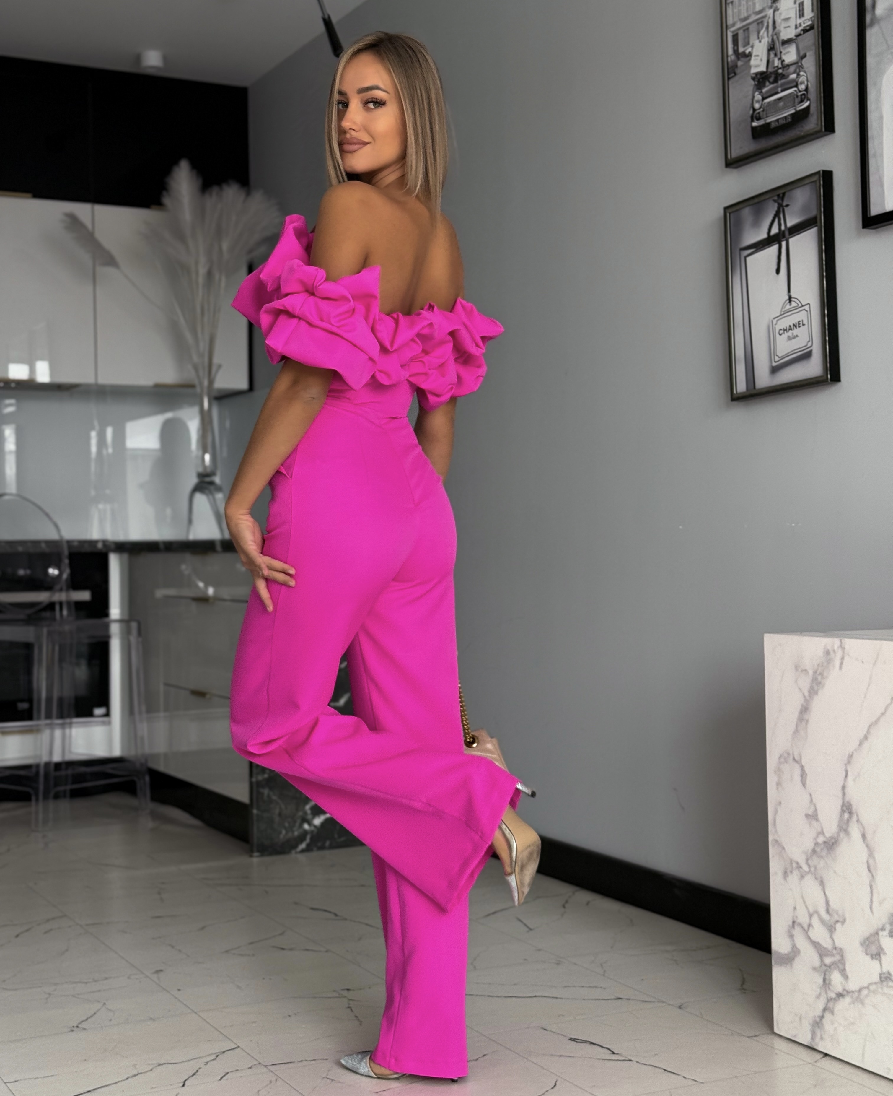 Fuksia pikk pidulik volangidega jumpsuit – stiilne naiste pükstükk paistab silma efektse ja koheva Hispaania stiilis ülaosaga, mis lisab riietusele naiselikku elegantsi ja pilkupüüdvat iseloomu. Trendikas lõige koos rõhutatud vöökohaga toob kaunilt esile figuuri ning loob tasakaalustatud ja elegantse silueti.