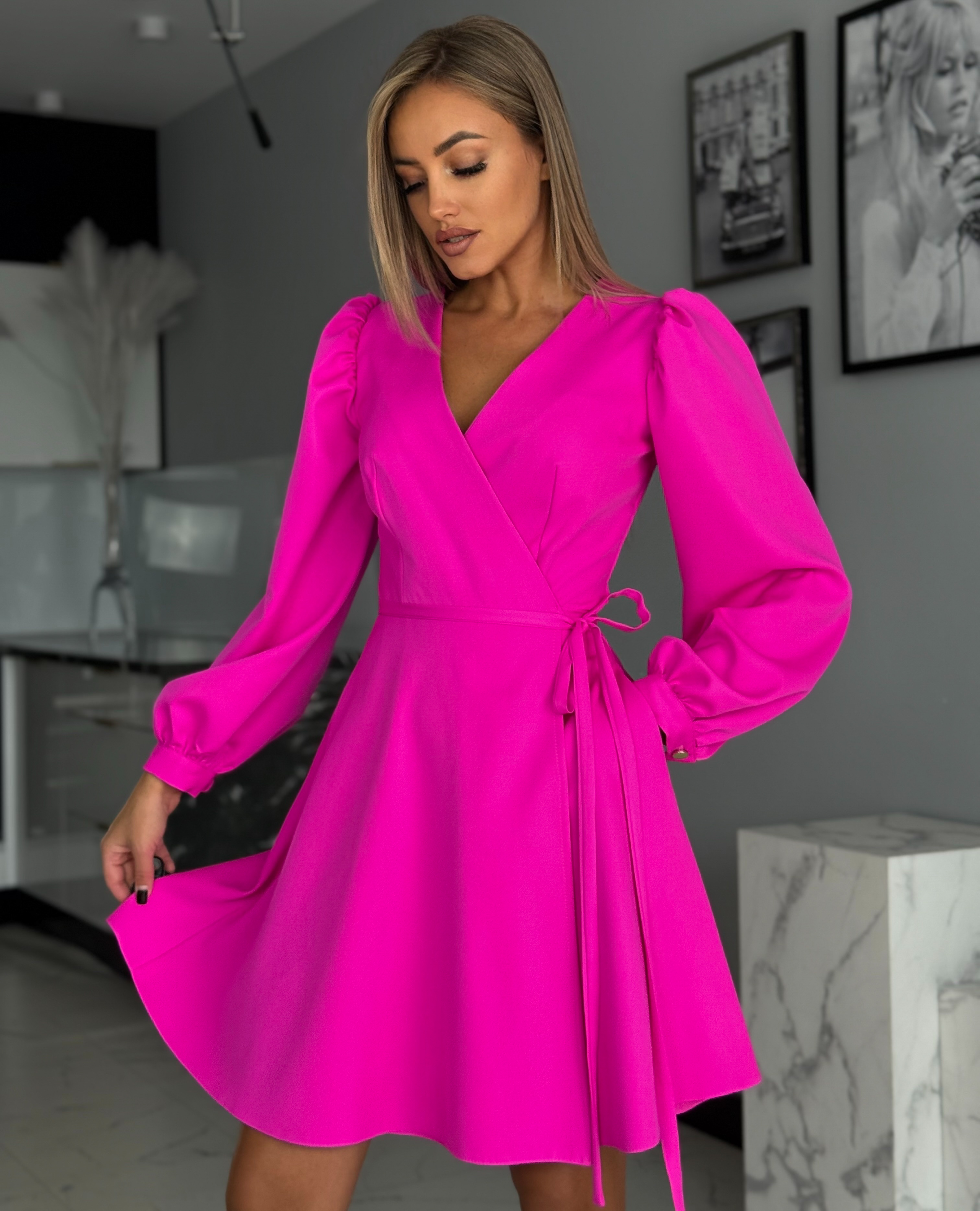 Fuksia pikkade varrukatega kellukese lõikeline hõlmikkleit võlub oma ajatu elegantsi ja naiseliku stiiliga. Klassikaline lõige koos kauni v-kaelusega lisab kleidile õrna ja peene ilme, mis sobib suurepäraselt nii pidulikeks sündmusteks kui ka igapäevaseks kandmiseks.