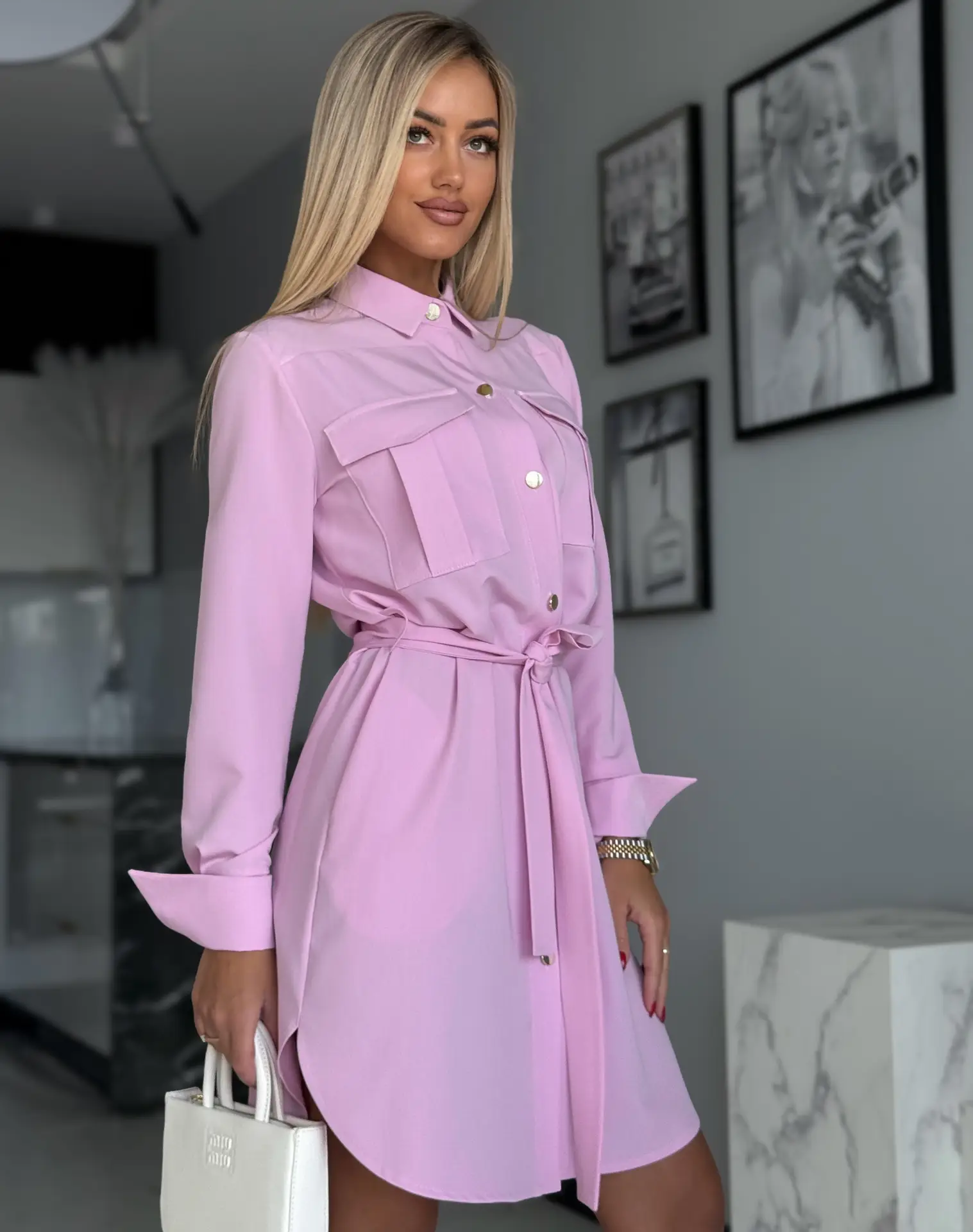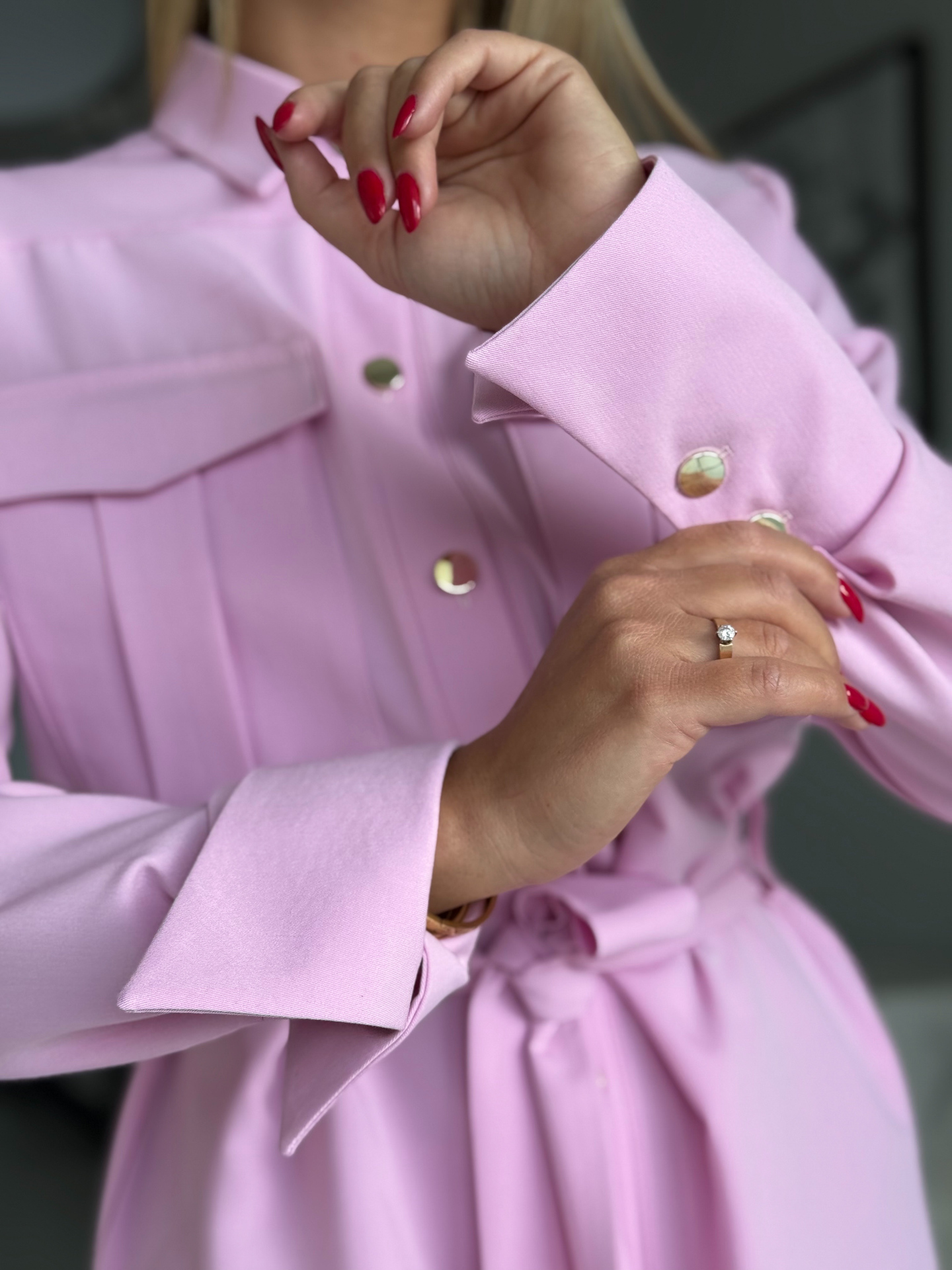 Kleit kinnitub kogu pikkuses kuldsete nööpidega, tal on küljetaskud, vööga vöökoht, rinnataskute imitatsioonid ja taga peen vöökoht. See on ideaalne kleit õhtuseks väljasõiduks, töökohtumiseks või eriliseks sündmuseks.