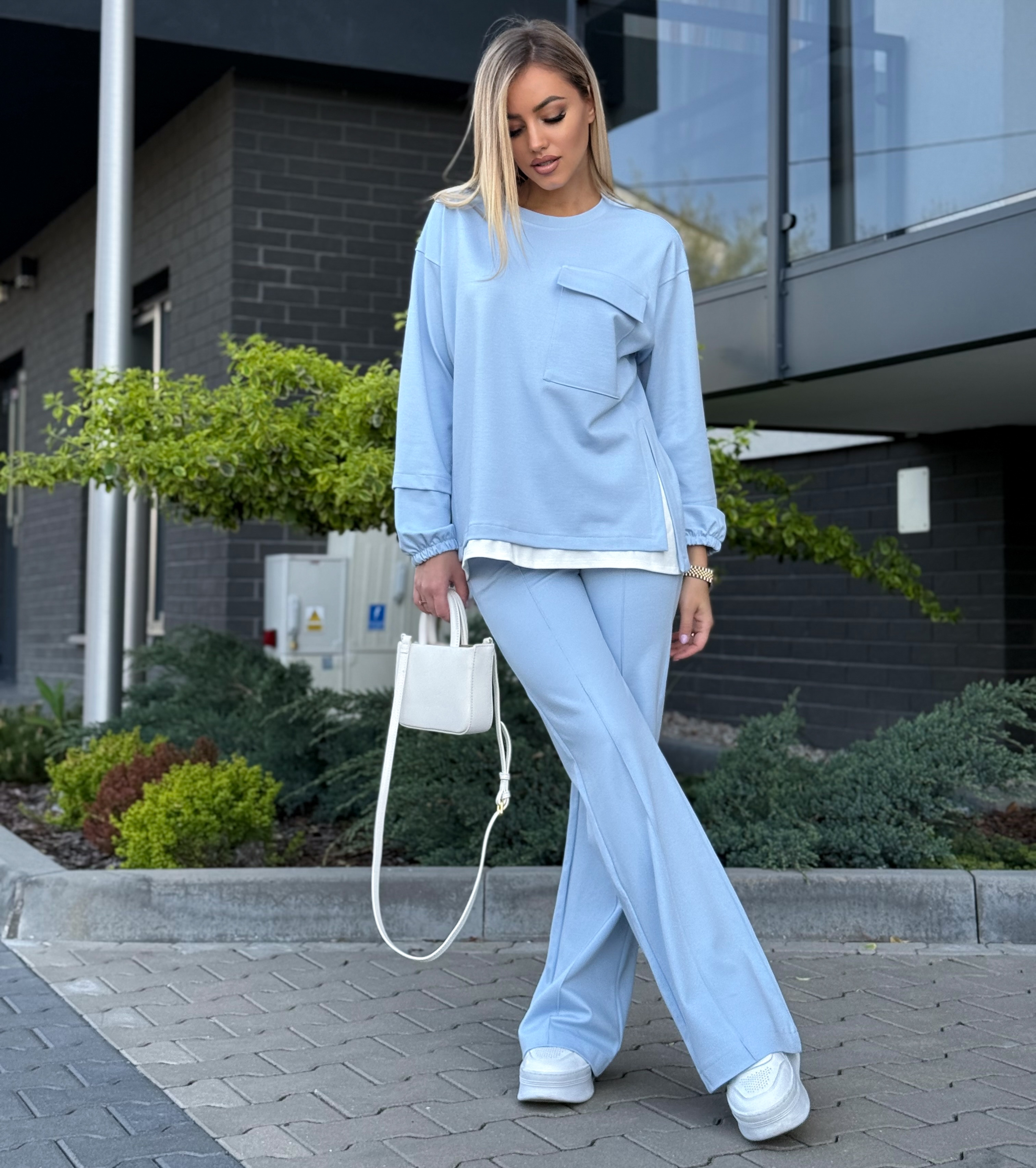 Helesinine 2-osaline puuvillane vabaajakomplekt on naisele, kes hindab nii stiilset välimust kui ka liikumisvabadust.