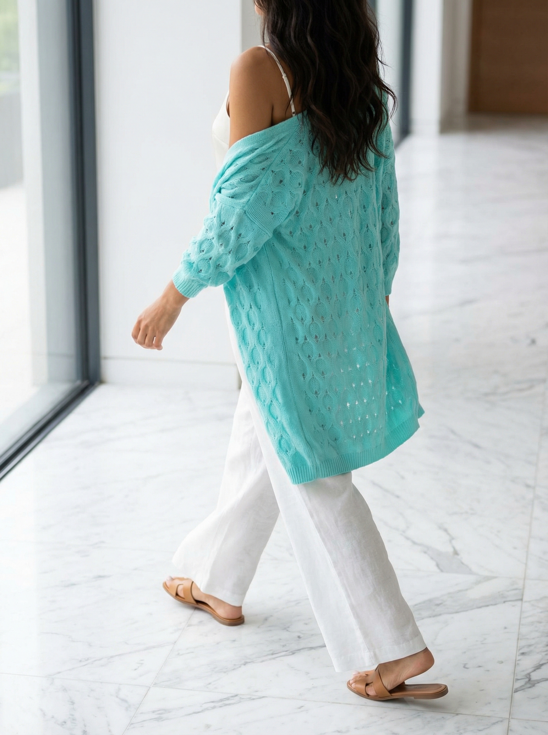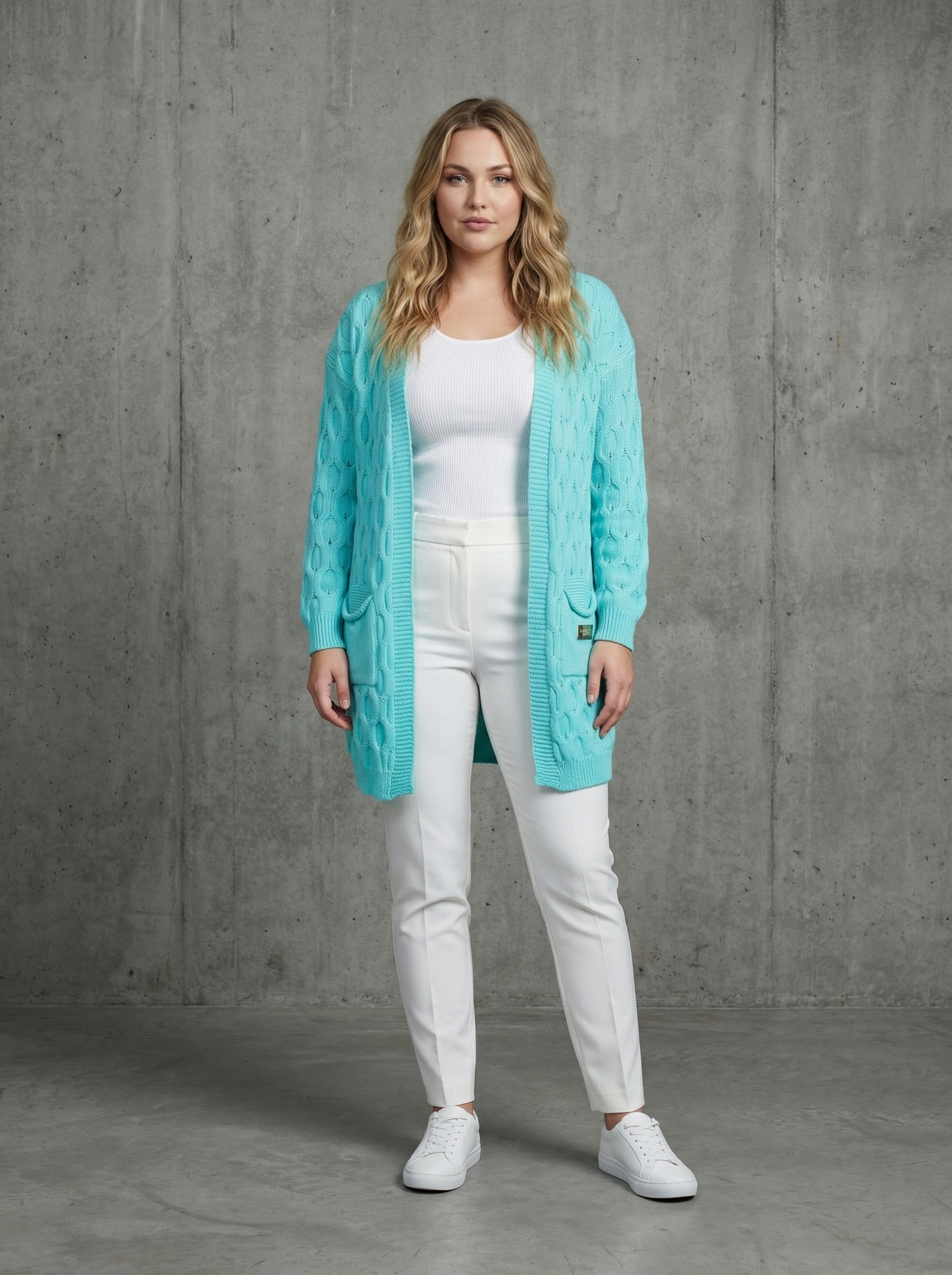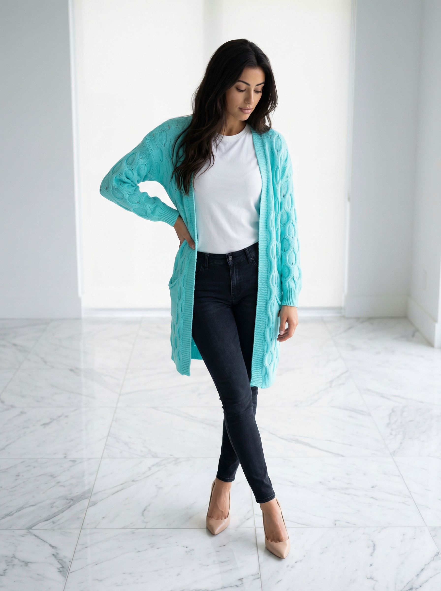 Helesinine kootud kardigan on pikk, soe ja mugav valik jahedama ilma perioodiks.