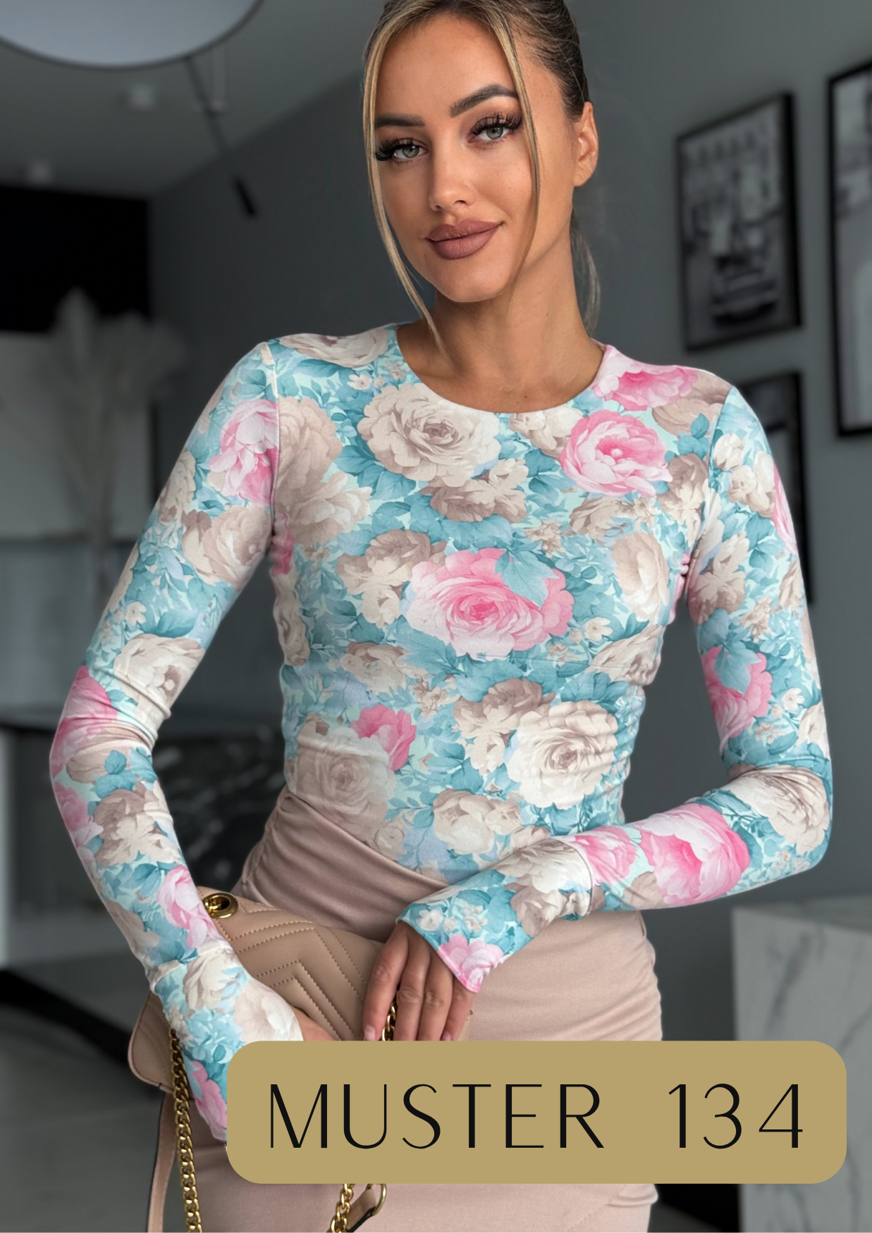 Helesinine lilledega pluus on kvaliteetne, topeltkangast ning täpselt kehasse.