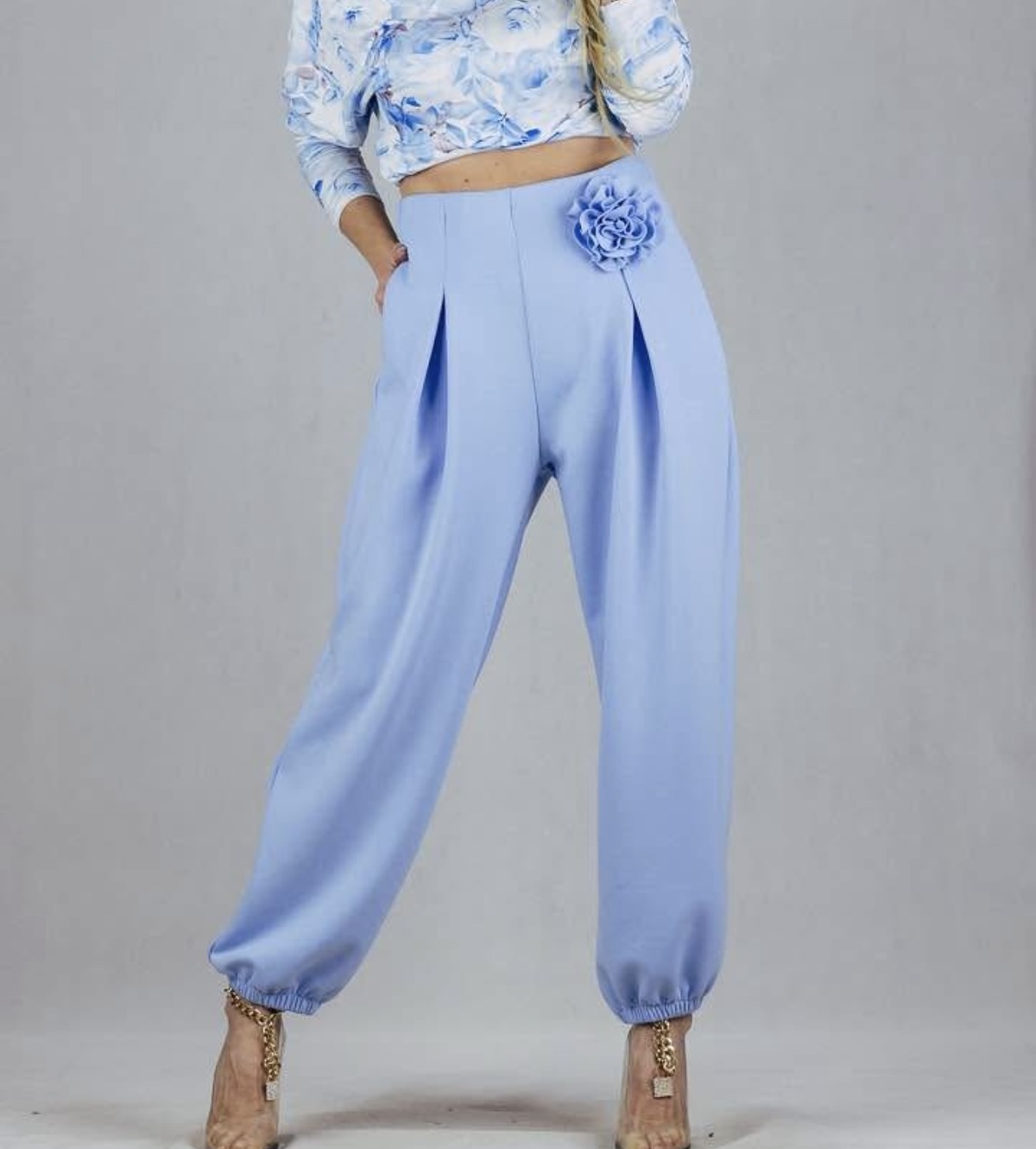 Helesinised laiad püksid roosi kaunistusega on alt kroogitud püksid- universaalsed püksid nii oma mõõtude kui stiili poolest.