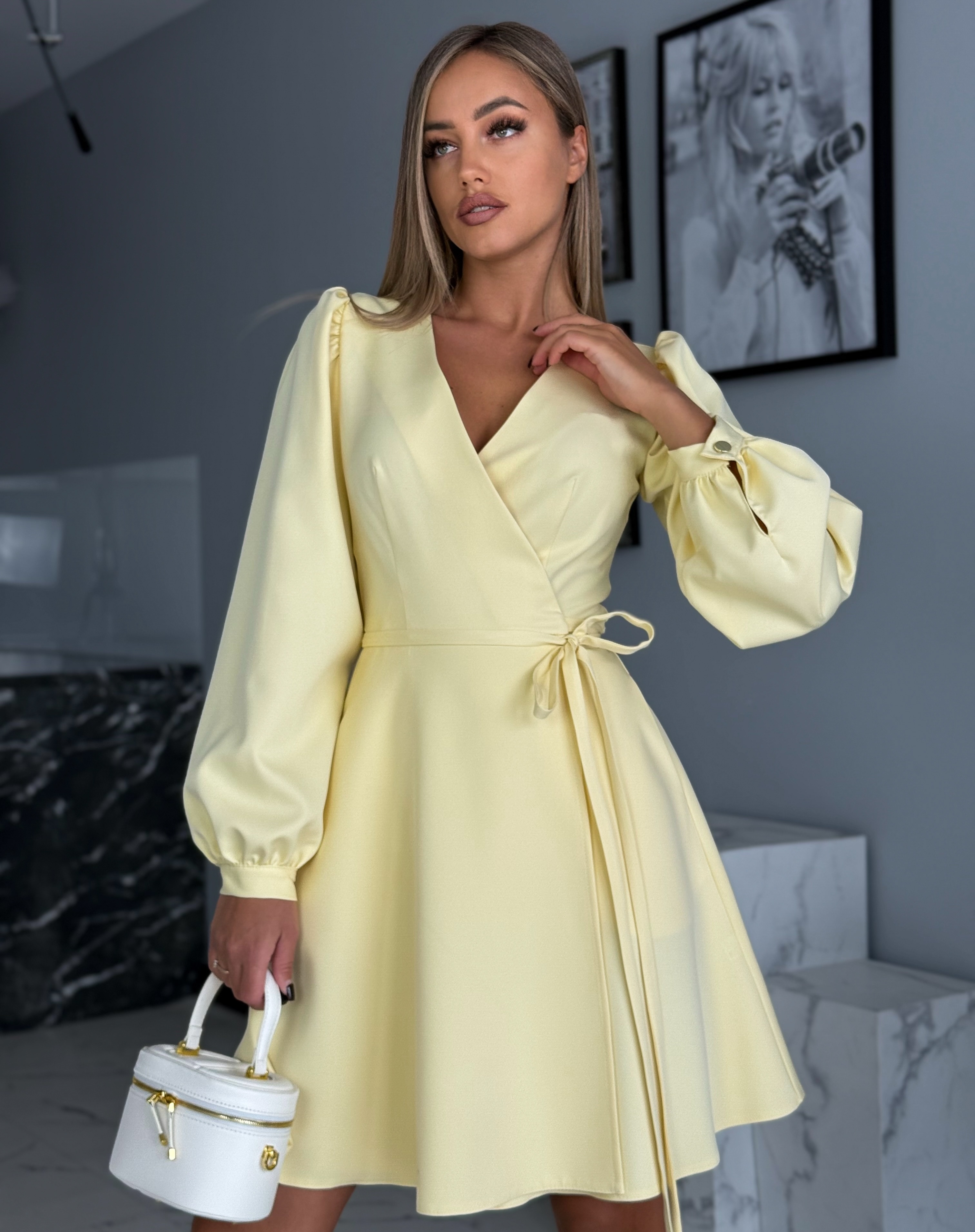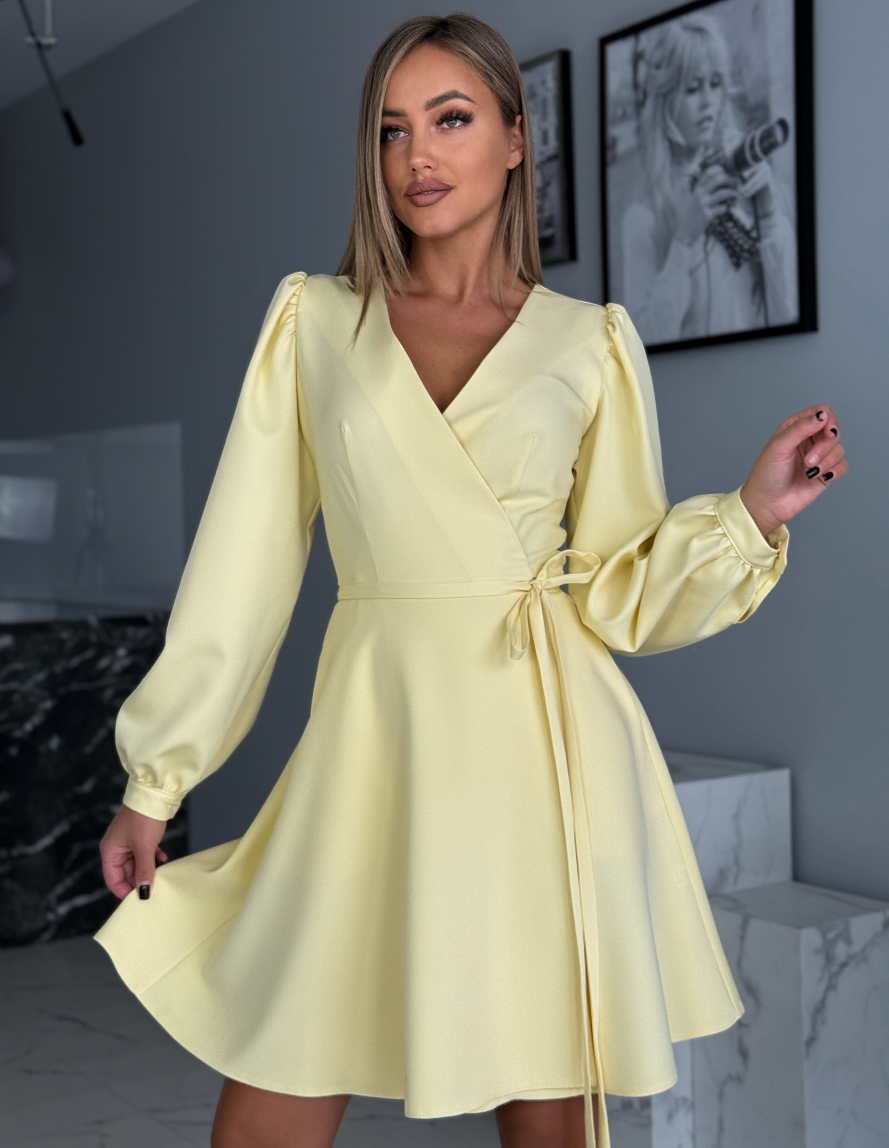 Kollane pikkade varrukatega kellukese lõikeline kleit võlub oma ajatu elegantsi ja naiseliku stiiliga. Klassikaline lõige koos kauni v-kaelusega lisab kleidile õrna ja peene ilme, mis sobib suurepäraselt nii pidulikeks sündmusteks kui ka igapäevaseks kandmiseks.