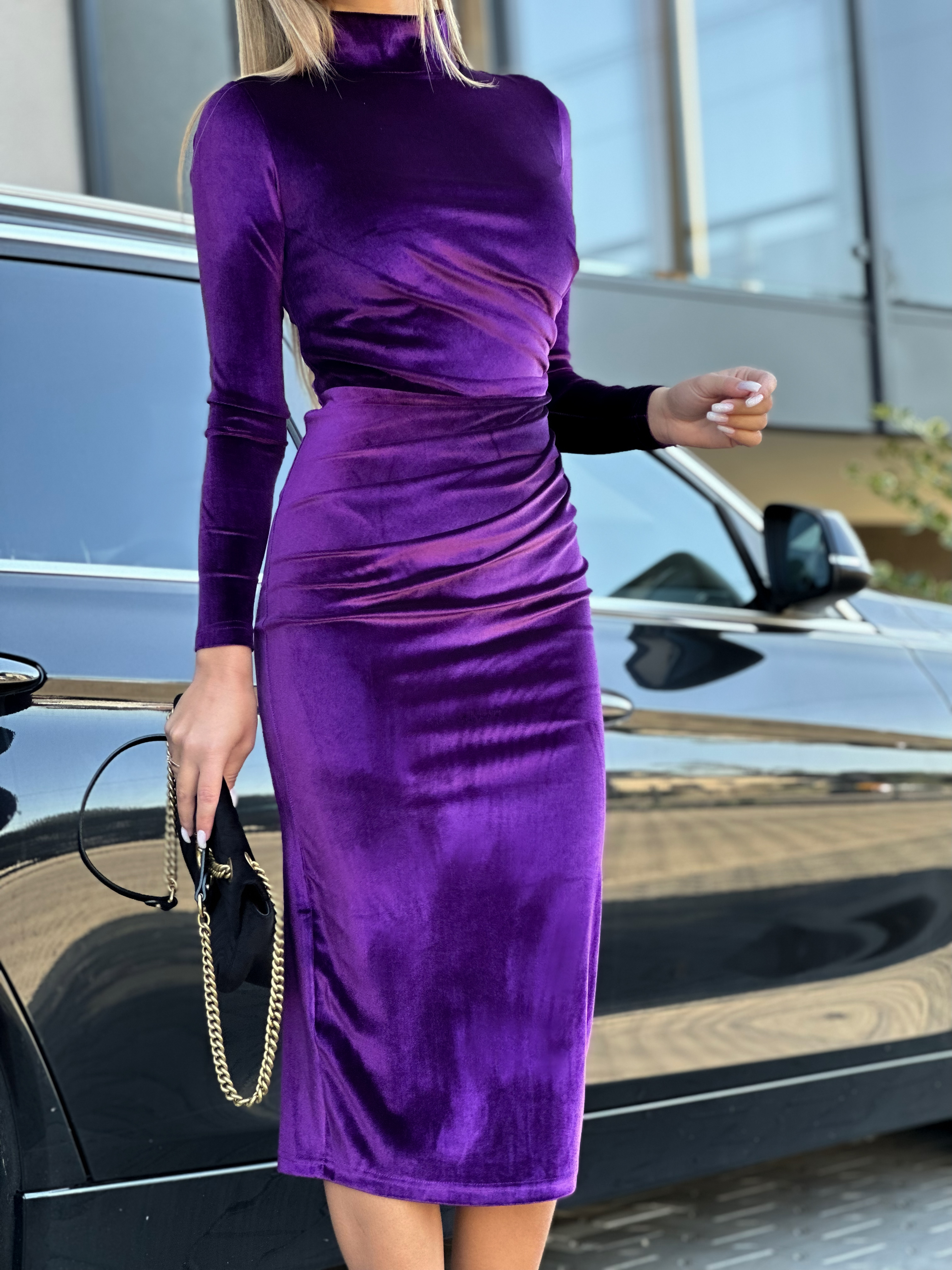Lilla midipikkuses sametkleit. See elegantne sametist midi kleit on liibuva lõikega ja valmistatud kvaliteetsest kangast. Sellel on kõrge kaelus ja küljel volangid, mis rõhutavad naiselikke kurve. Kleit kinnitub lukuga. Iga naine tunneb end selles stiilis erakordselt ja mugavalt. See sobib ideaalselt erinevateks pidulikeks sündmusteks, õhtusteks väljasõitudeks ja töökohtumisteks.