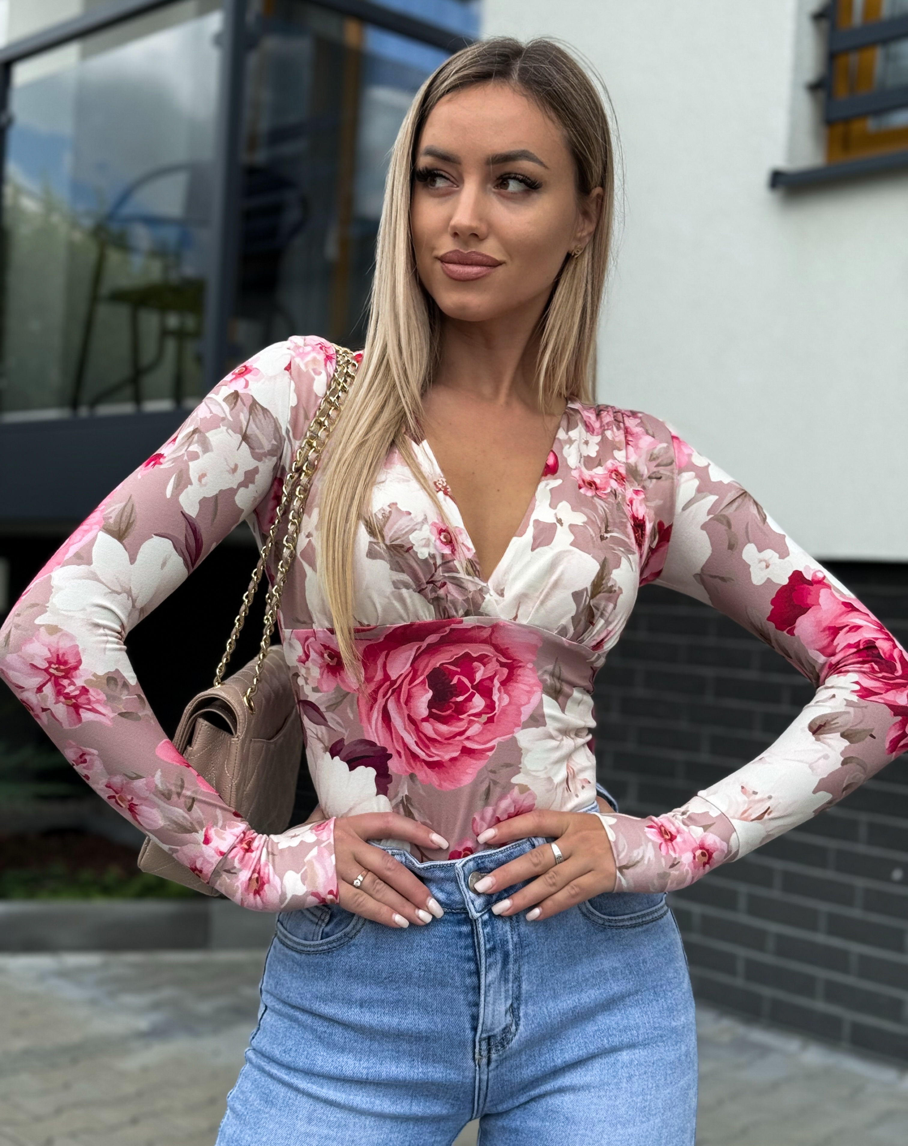 Lilled beezil taustal v-kaelusega pluus on kvaliteetne, topeltkangast ning täpselt kehasse.
