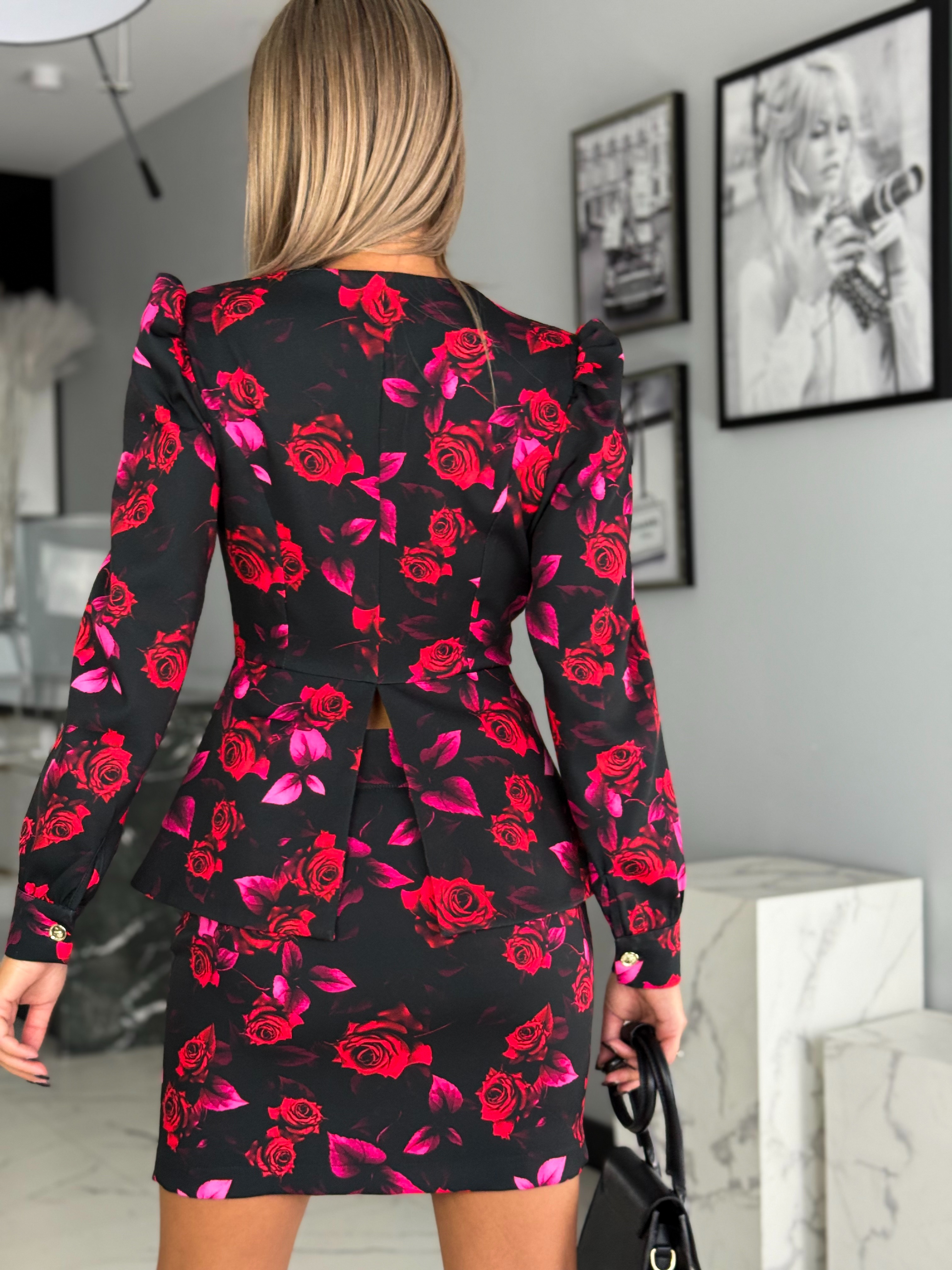 Must lilledega seeliku ja pintsakuga viisakas komplekt. See stiilne naiste kostüümikomplekt on ideaalne valik naisele, kes hindab elegantset välimust ja kvaliteetset disaini. Komplekt koosneb naiselikust jakist ja figuuri järgiva lõikega seelikust, luues koos ajatu ja šiki terviku, mis sobib nii pidulikeks sündmusteks kui ka linnas käimiseks.