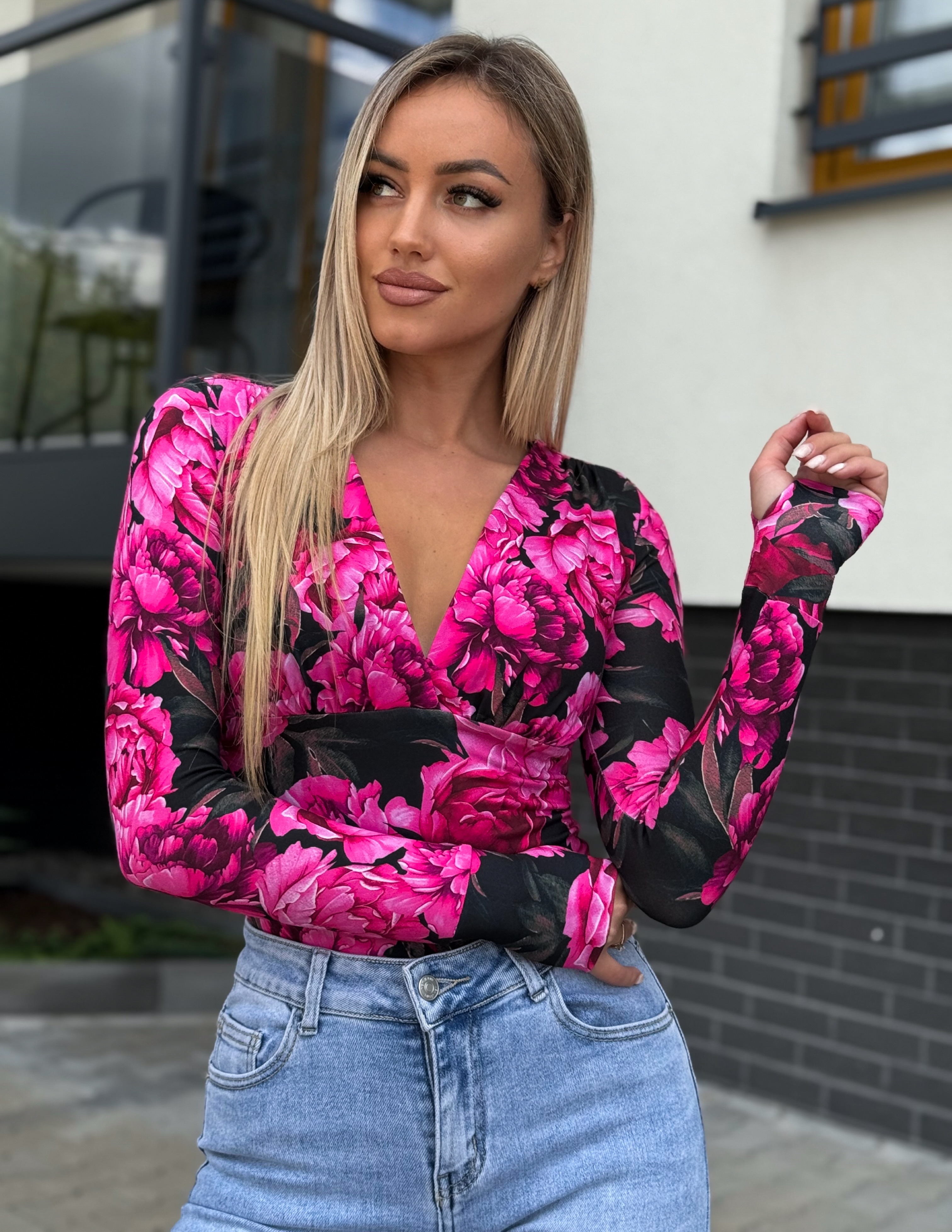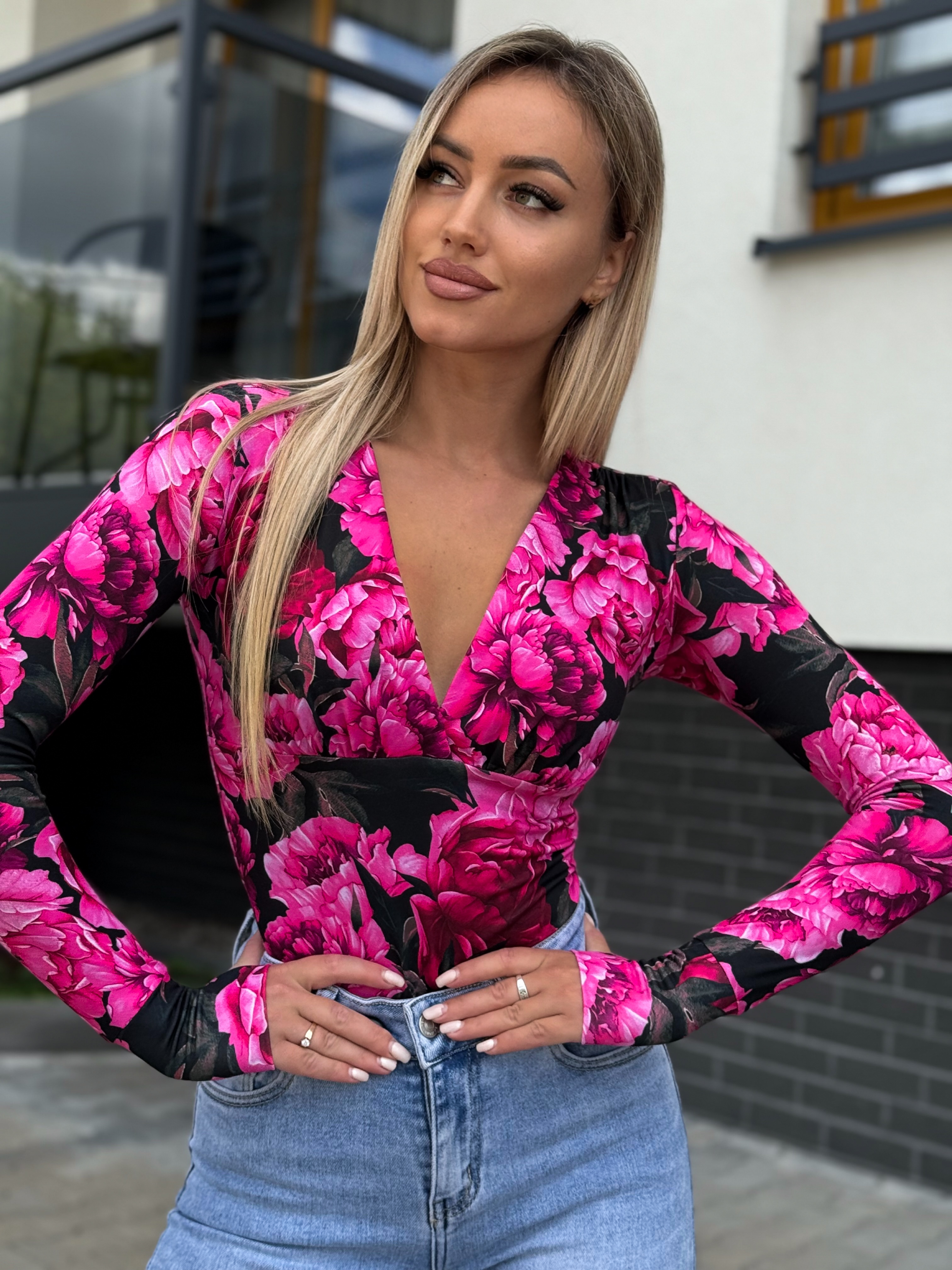 Mustal taustal roosade lilledega v-kaelusega pluus on kvaliteetne, topeltkangast ning täpselt kehasse.