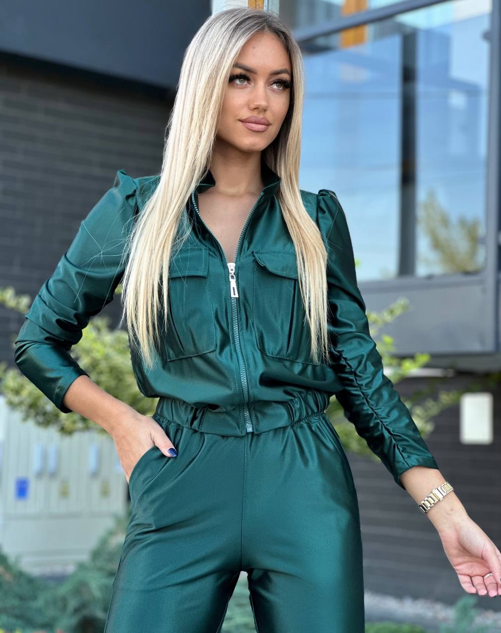 Komplekti kuuluvad satiinist püksid elastse värvliga ning mugav lukuga pusa püstkraega, mis lisab kogu komplektile elegantset ja šikki ilmet. Tänu hästi läbimõeldud lõikele istub komplekt kaunilt kehasse ning pakub samal ajal vabadust liikuda.