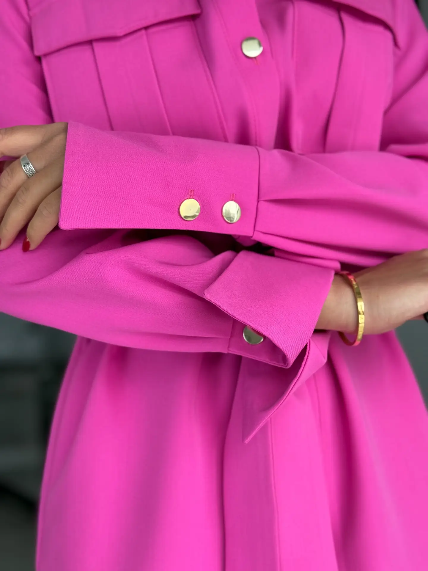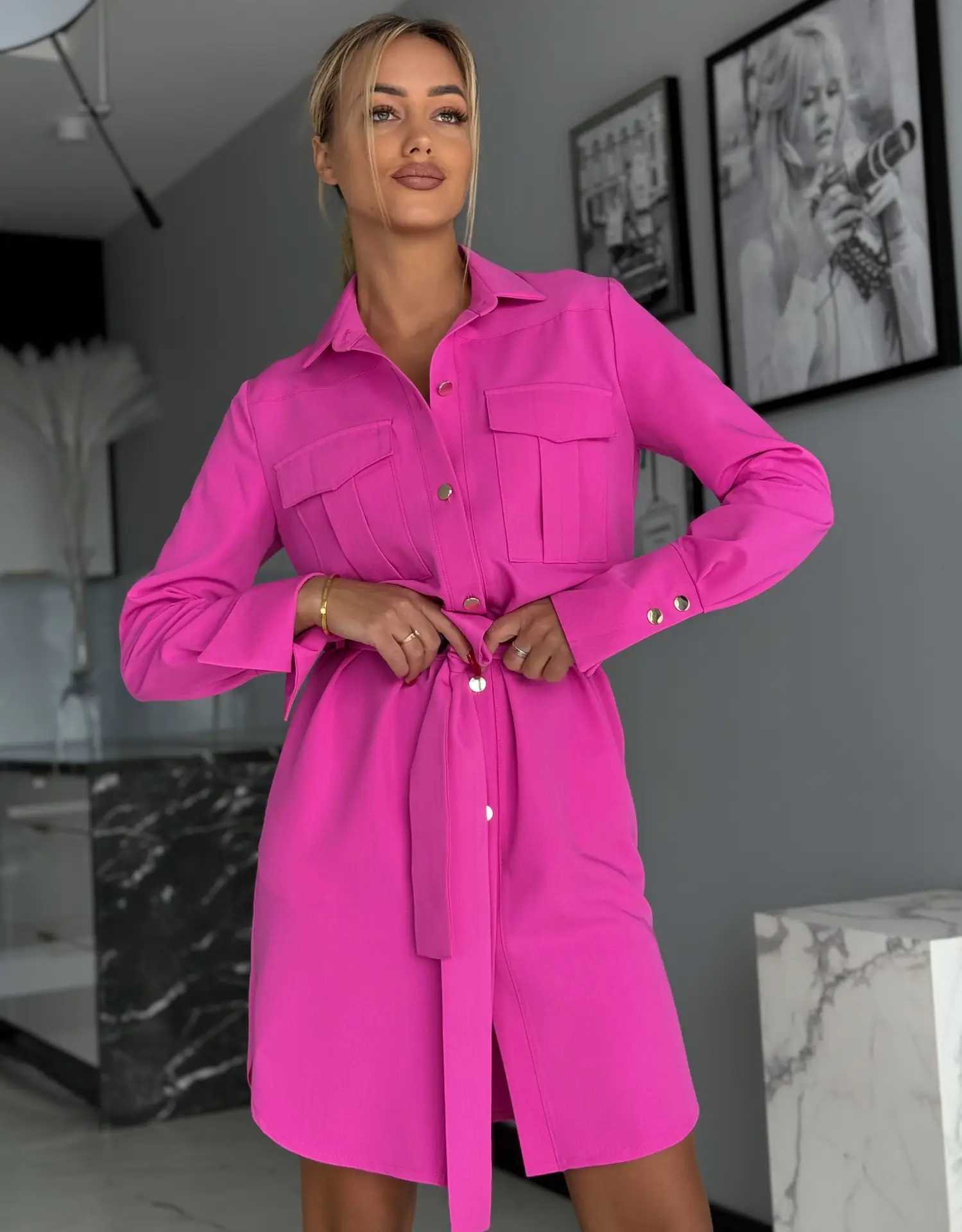 Kleit kinnitub kogu pikkuses kuldsete nööpidega, tal on küljetaskud, vööga vöökoht, rinnataskute imitatsioonid ja taga peen vöökoht. See on ideaalne kleit õhtuseks väljasõiduks, töökohtumiseks või eriliseks sündmuseks.