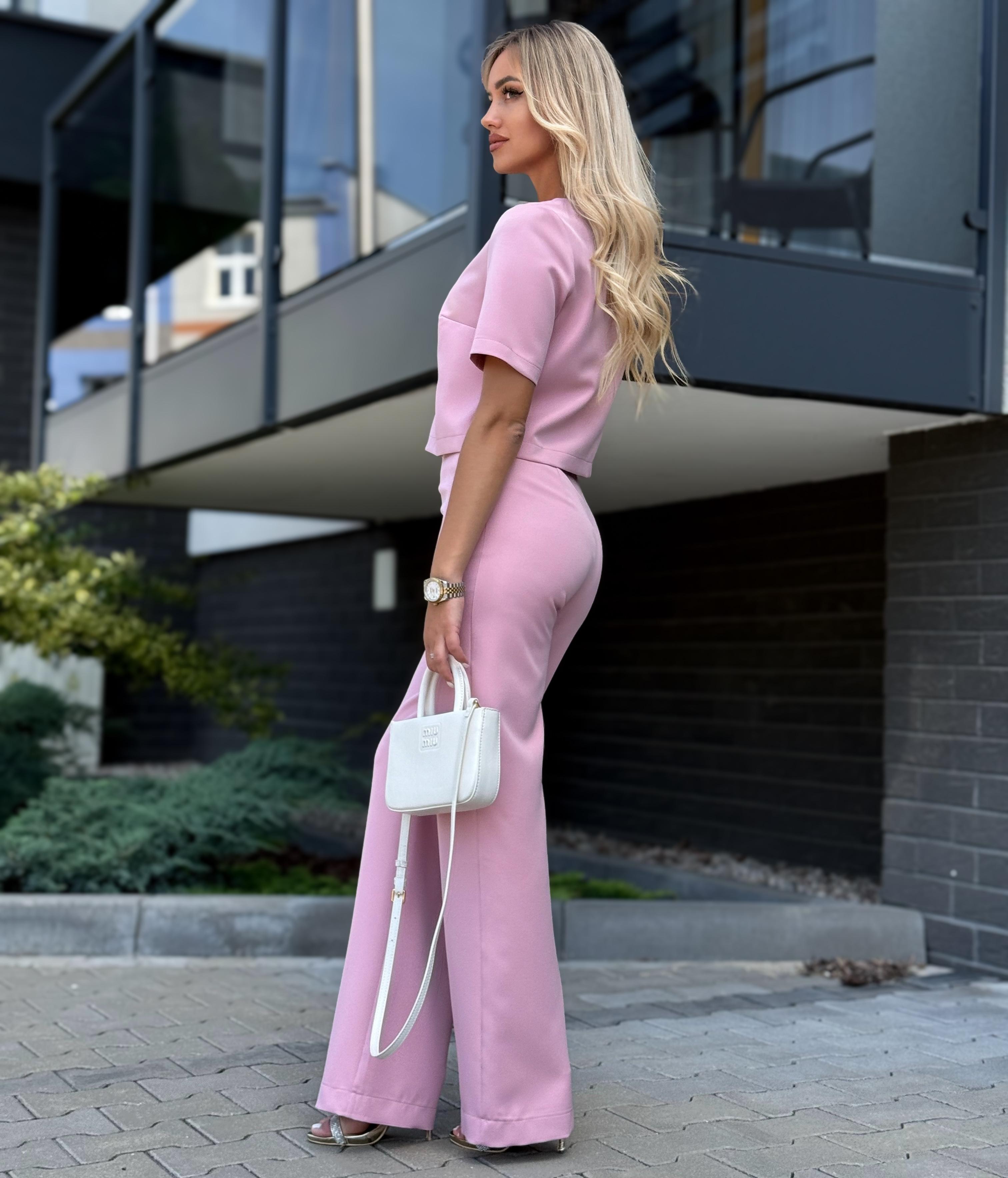 Komplekti kuulub lühike oversized-lõikega pluus ning kõrge vöökohaga laiad sirgelõikelised püksid, mis on varustatud luku ja nööpkinnitusega.