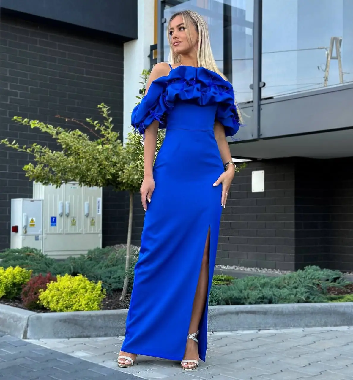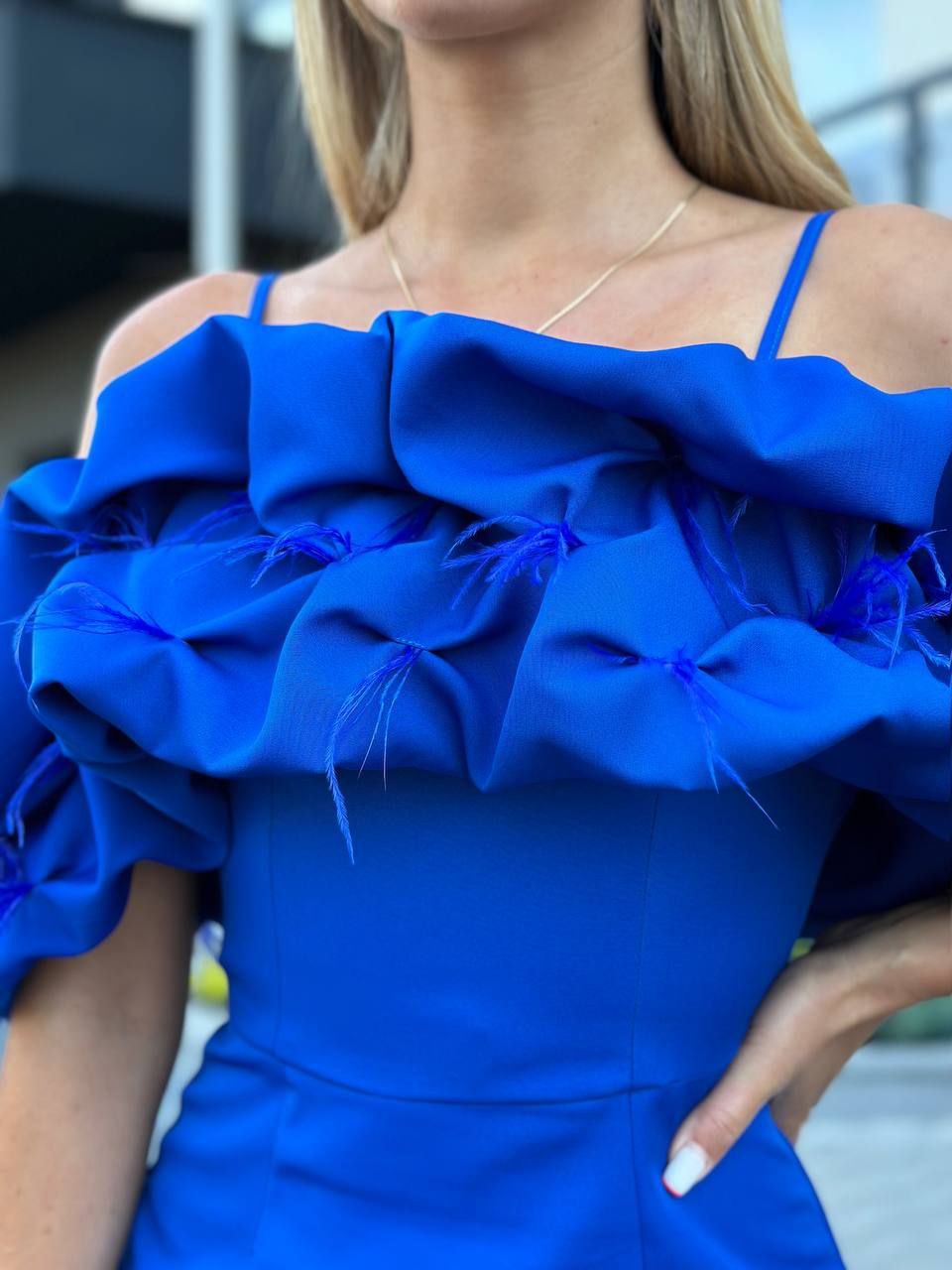 Sinine pikk pidulik kleit. Elegantne maani kleit pilkupüüdvate puhvis dekoltee ja varruka osaga. Disainil on õhukesed õlapaelad ja sulgedega kaunistused. Naturaalsed suled lisavad iseloomu. Minipikkus toob kaunilt esile jalad, muutes selle kleidi tõeliselt naiselikuks rõivaesemeks. Kleit kinnitub tagant lukuga. Kleidi lõige sobib ideaalselt õhtusteks üritusteks, galadeks, pidudeks, pulmadeks, ballidele ja muudeks erilisteks sündmusteks.