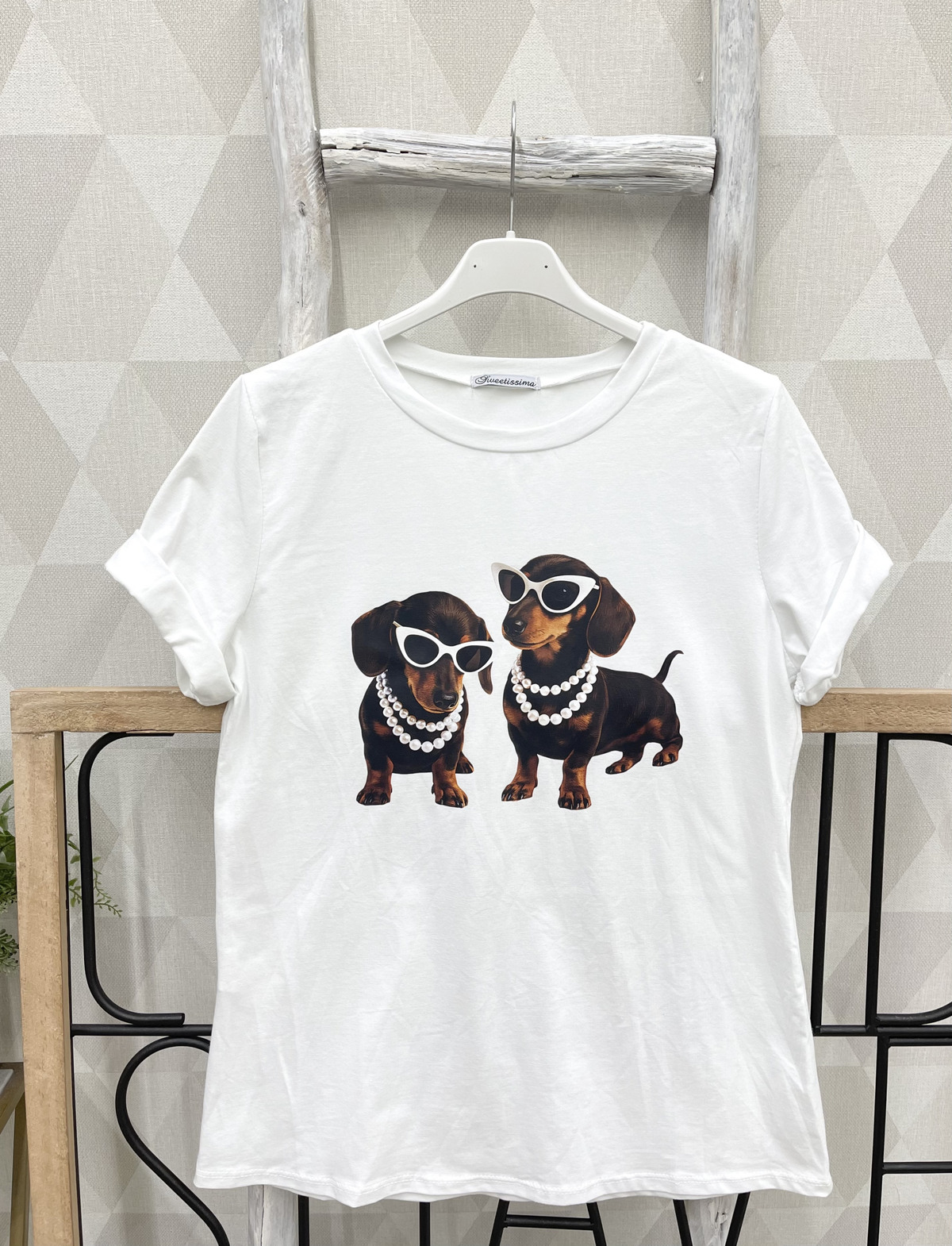 Taksikoeradega valge t-särk sobib hästi S-L kandjale.