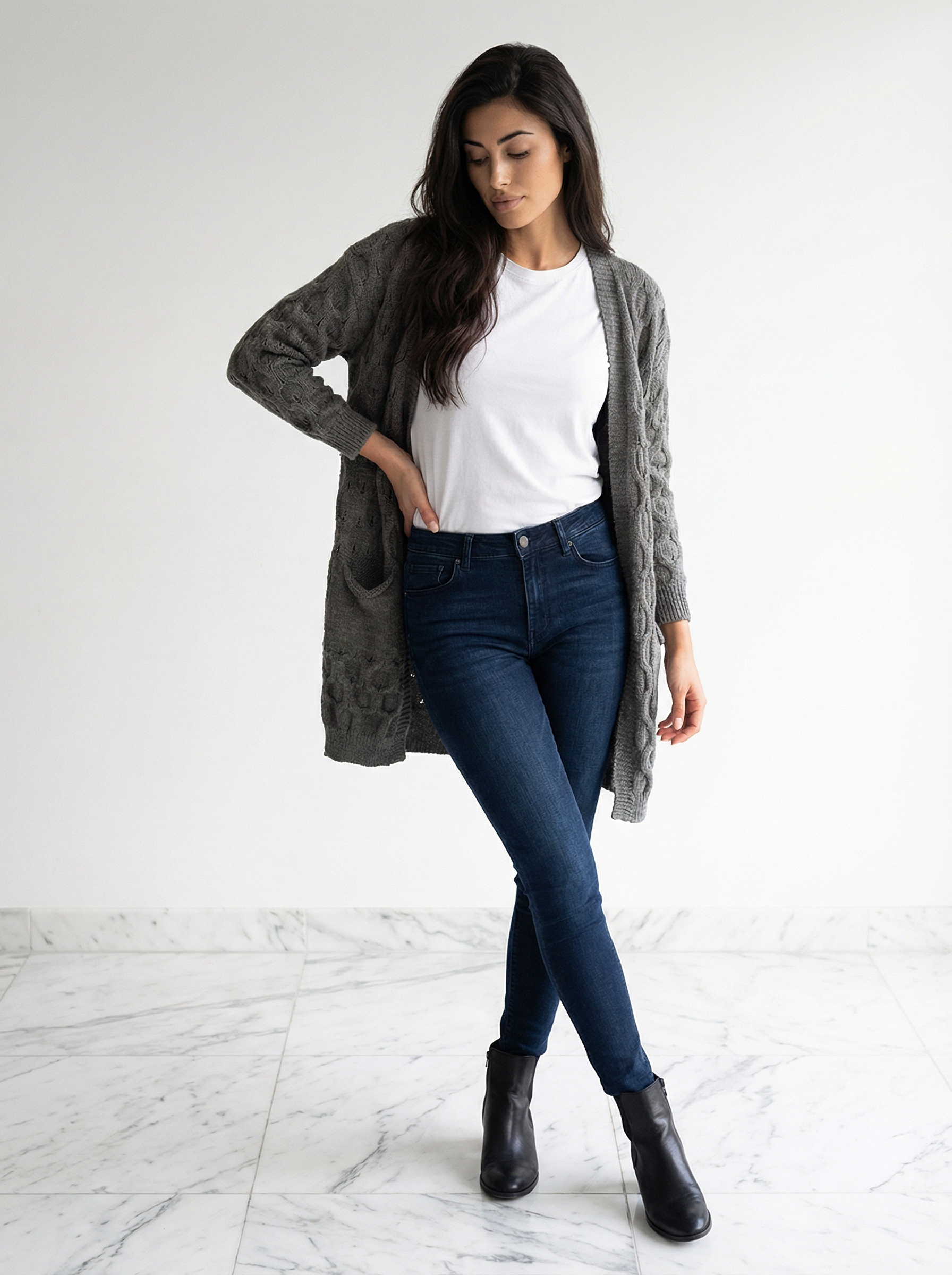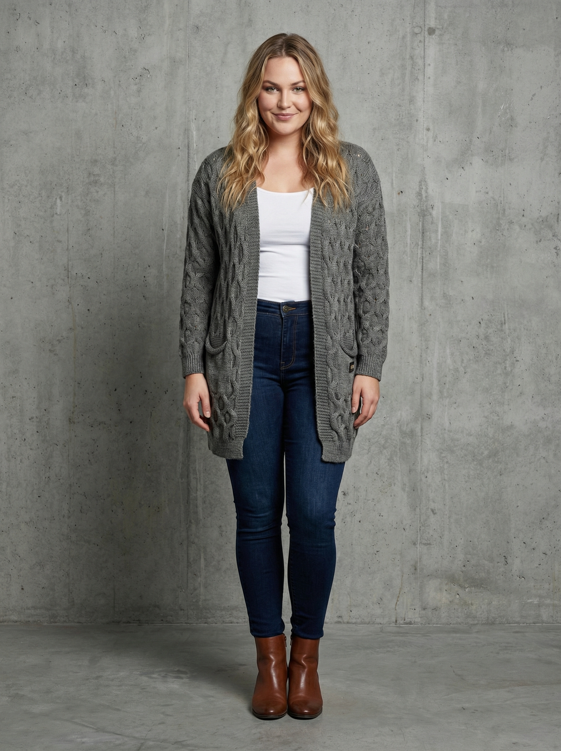 Tumehall kootud kardigan on poolpikk, soe ja mugav valik jahedama ilma perioodiks.