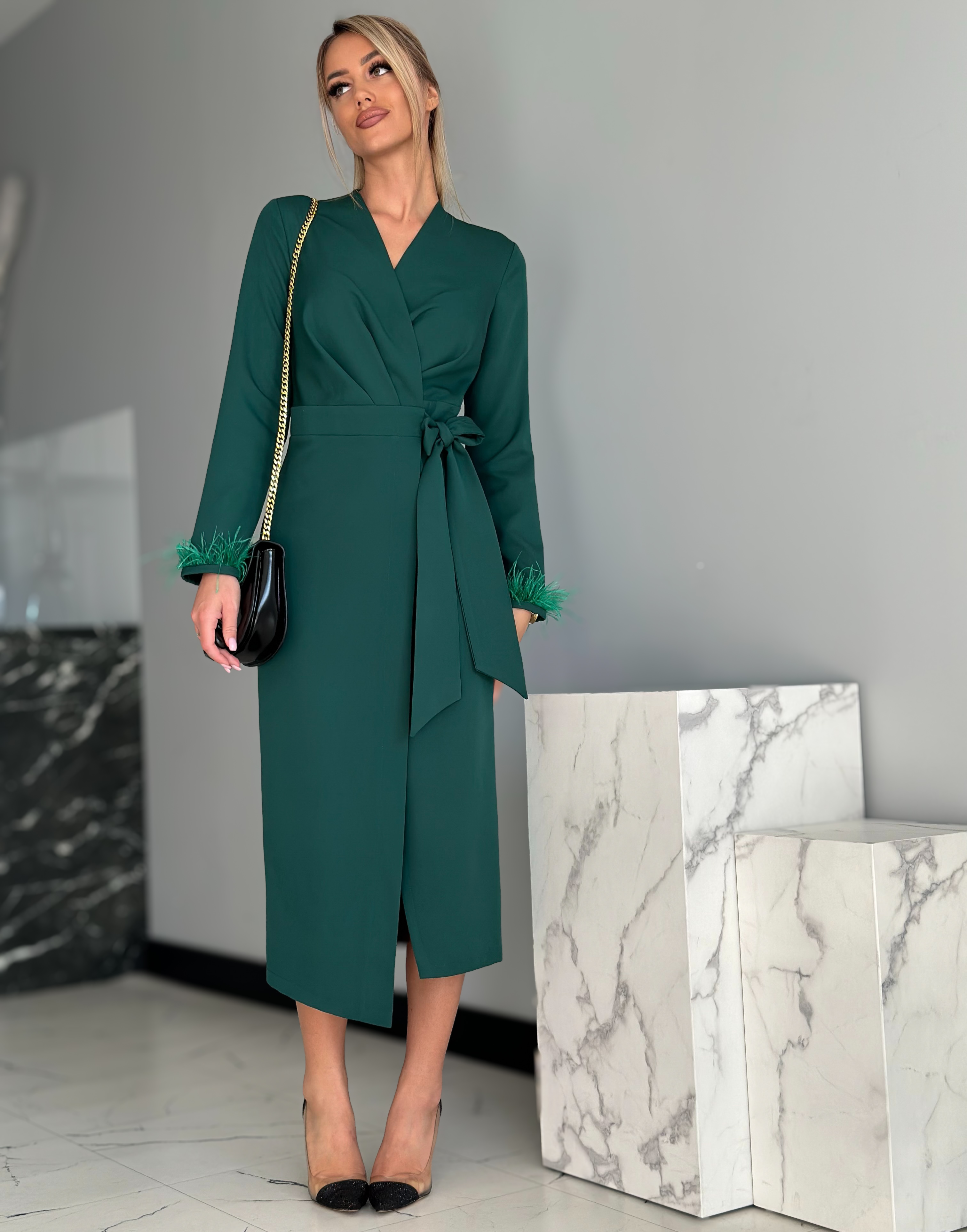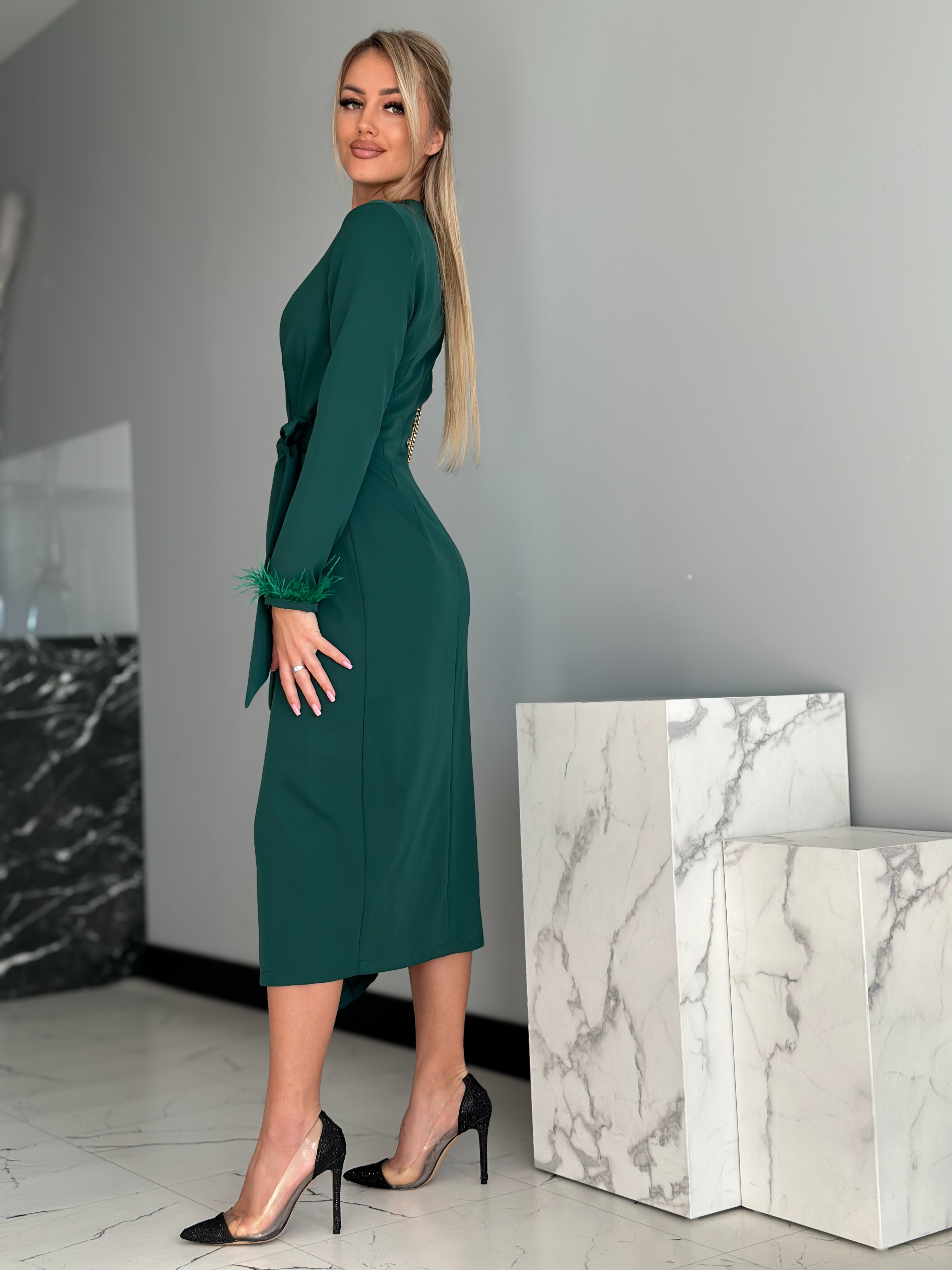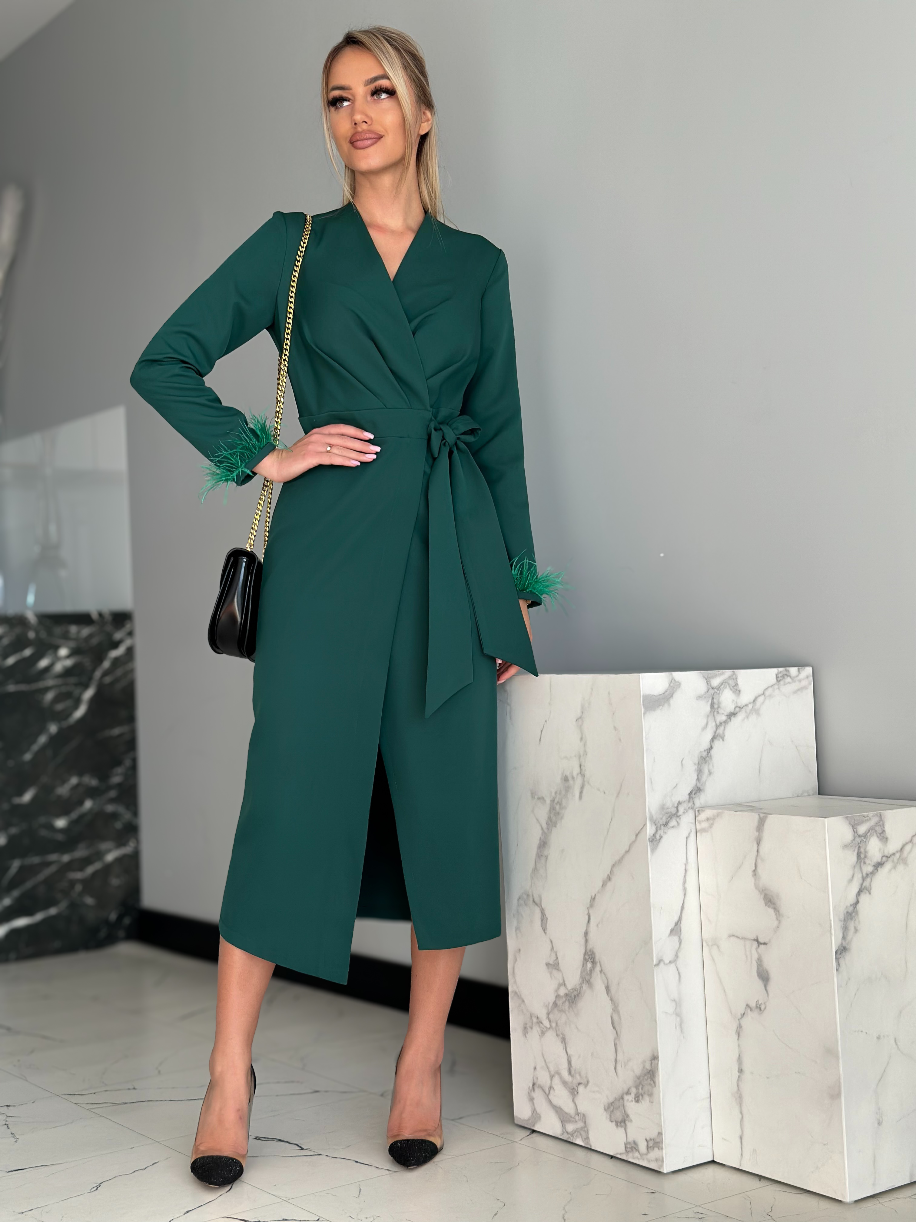 Tumeroheline sulevarrukatega midikleit on elegantne pikkade varrukatega kleit, mida kaunistavad varruka otstes olevad suled. See hõlmikkleit on v-kaelusega ning küljelt paeltega seotav. Hõlmikkleidi lõige annab vabadust kleidi järele anda või rohkem kinni siduda.