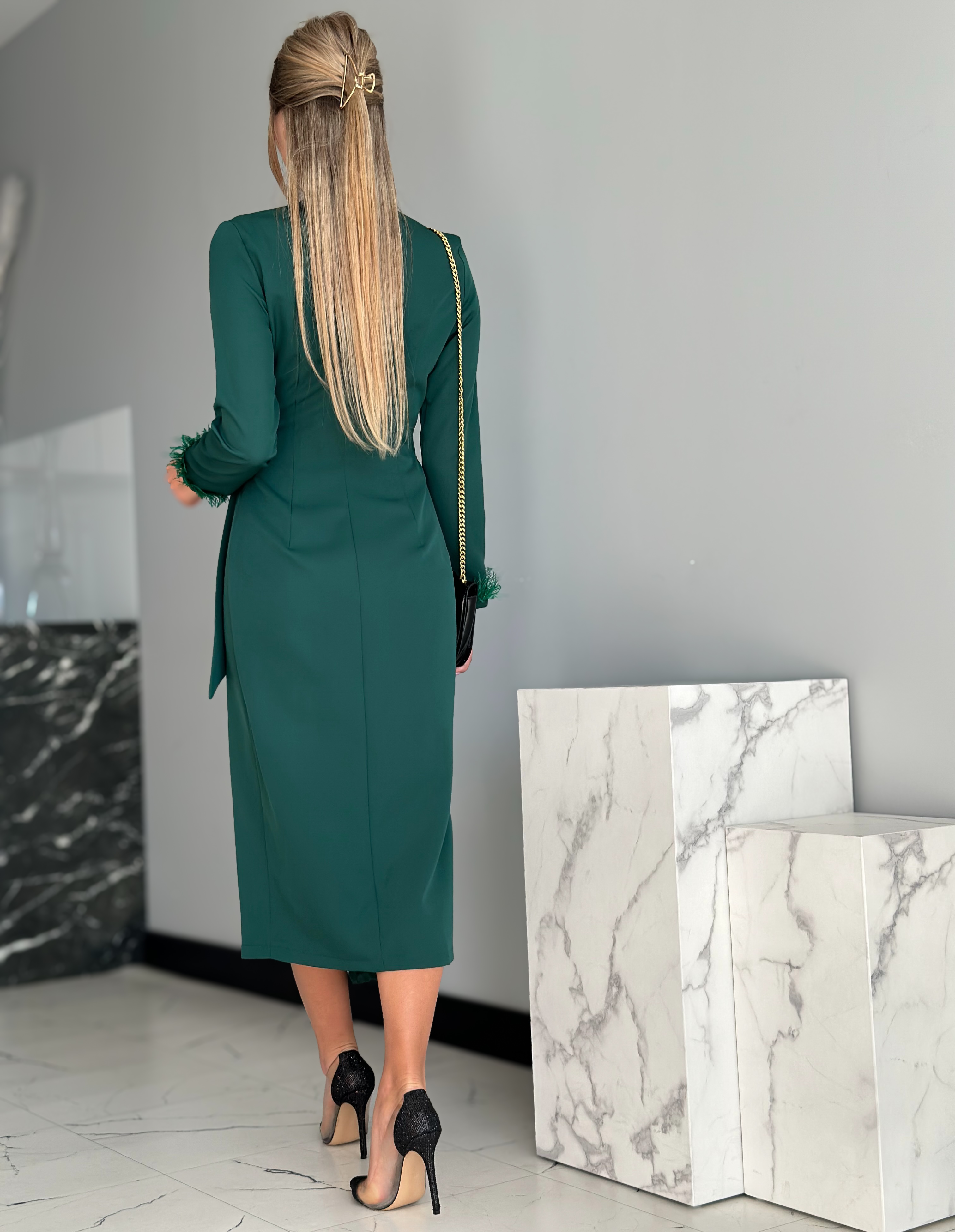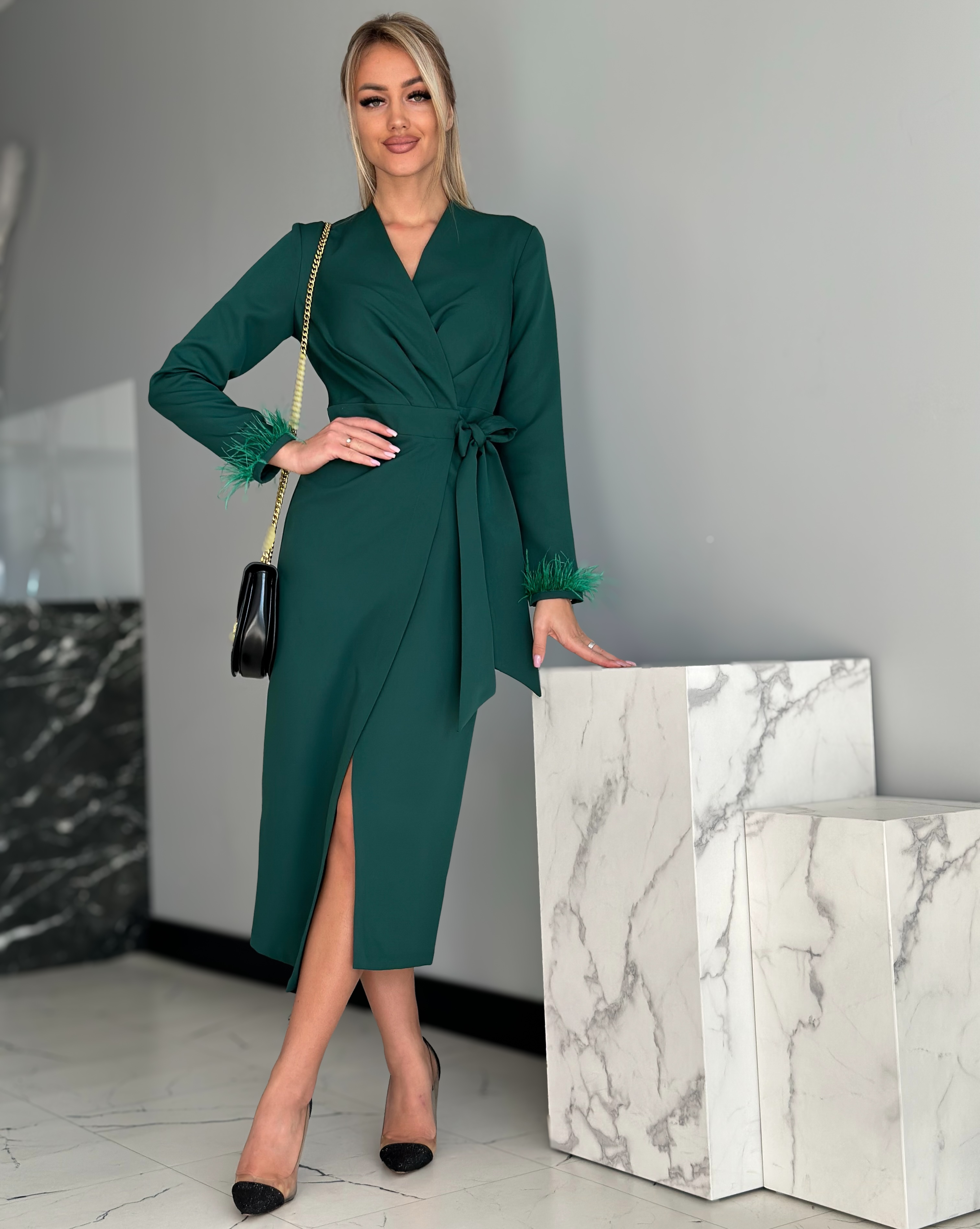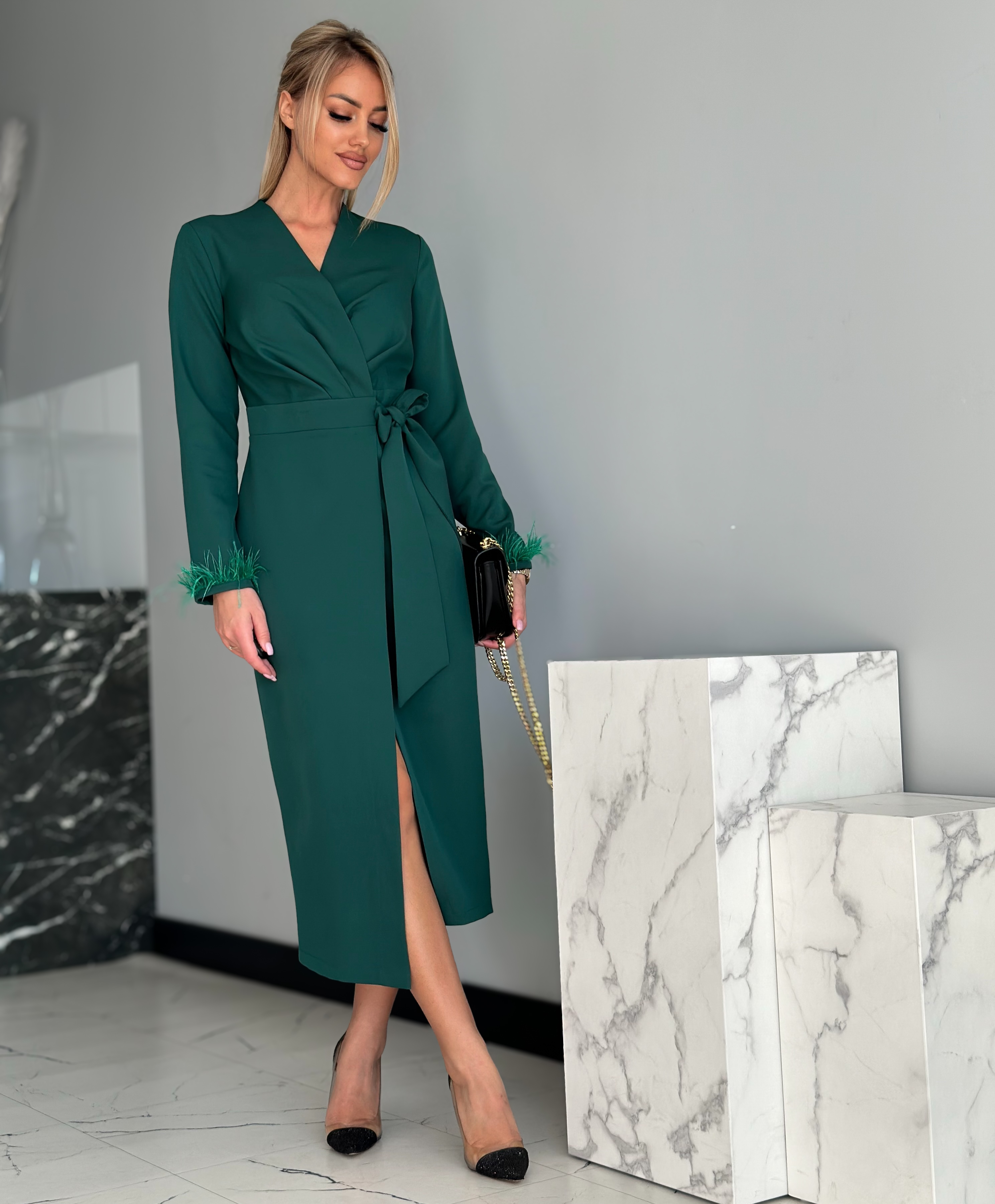 Tumeroheline sulevarrukatega midikleit on elegantne pikkade varrukatega kleit, mida kaunistavad varruka otstes olevad suled. See hõlmikkleit on v-kaelusega ning küljelt paeltega seotav. Hõlmikkleidi lõige annab vabadust kleidi järele anda või rohkem kinni siduda.